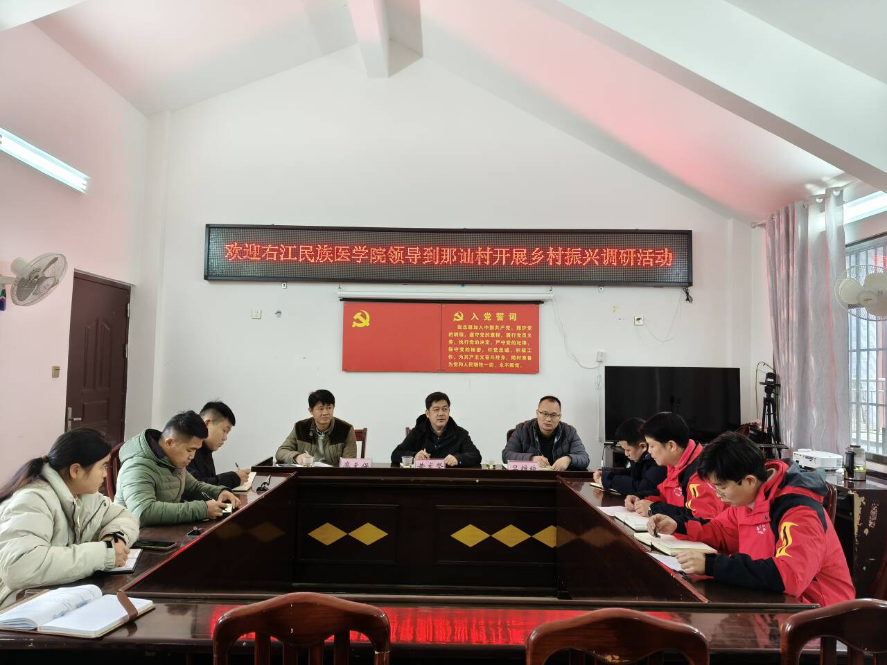3月18日,学校黄龙坚校长率队在那讪村村部召开座谈会。