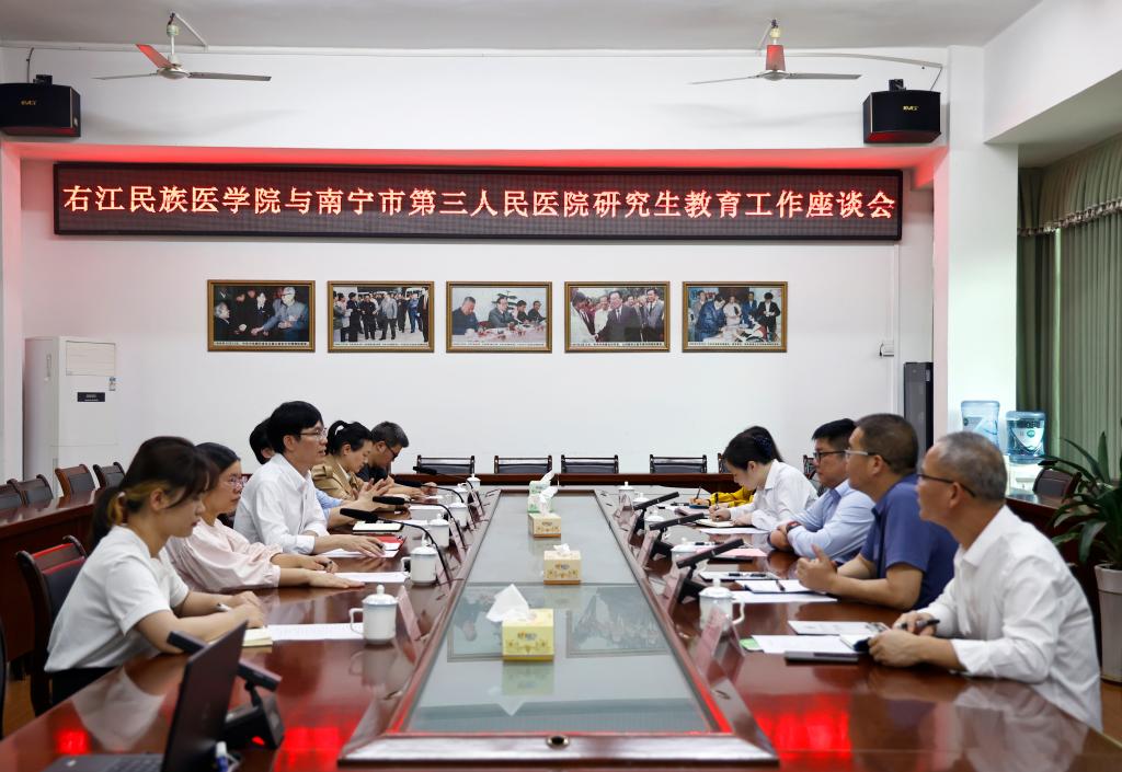 3月25日,南宁市第三人民医院院长谢丽圣带队到必赢官网调研交流。必赢官网在图书馆二楼会议室召开座谈会,学校党委常委、副校长解继胜出席会议,临床医学院、研究生学院相关负责人参加会议。