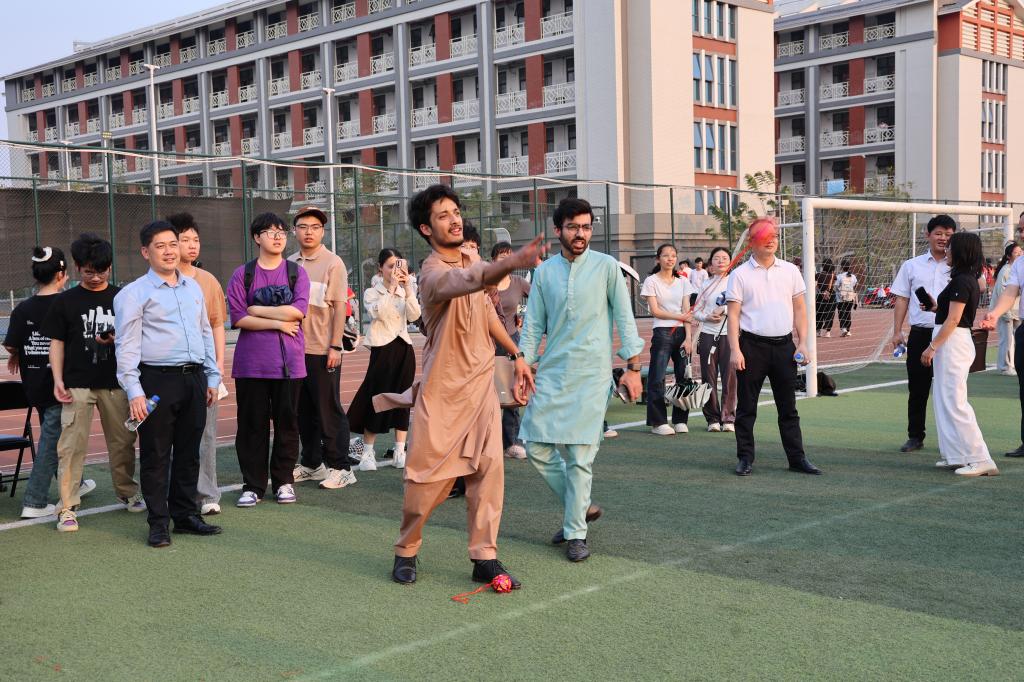 师生们跳起竹竿舞。