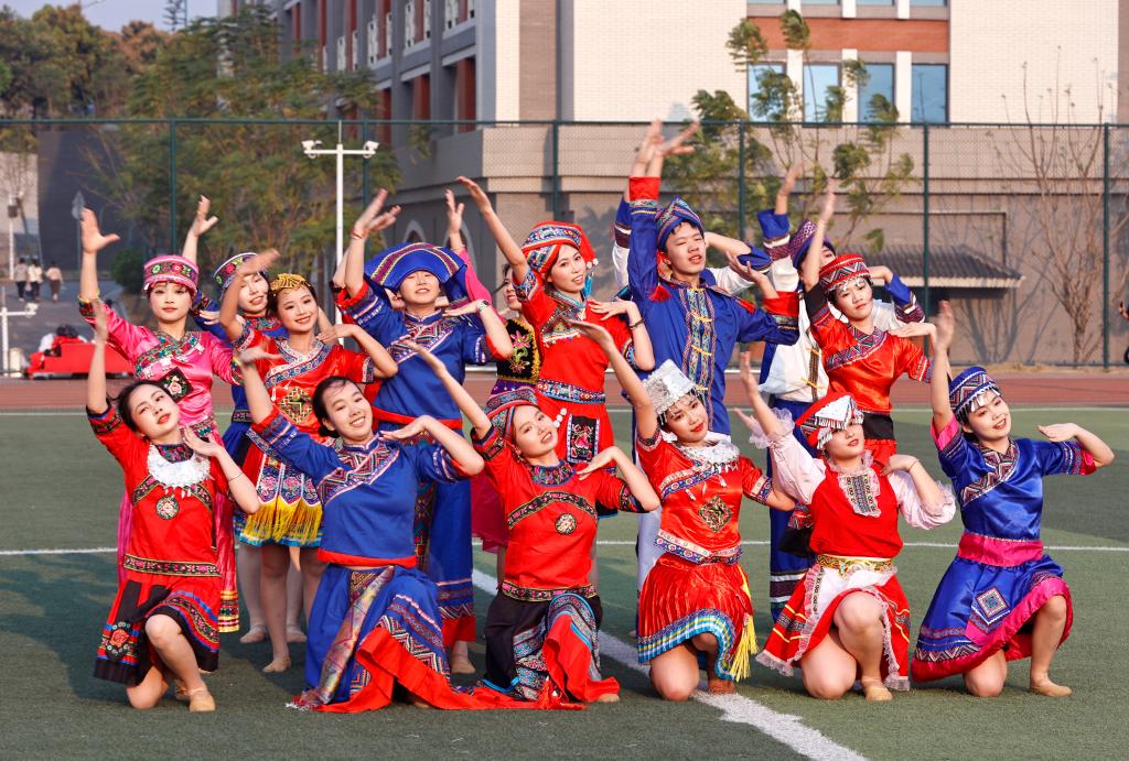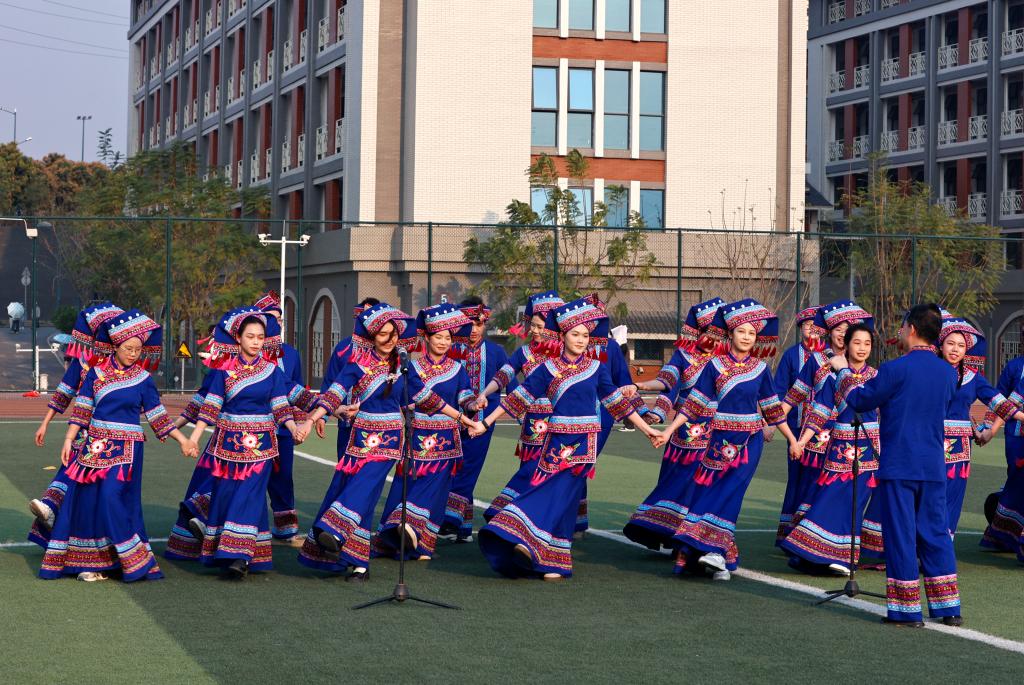 在欢快的旋律中,学校各族师生身着民族盛装,以《壮乡韵律》让拉丁舞韵律与壮乡音乐创新交融;以《爱我中华》凝聚爱国情怀,融入壮族元素展现民族团结教育新实践;以《同心共筑中国梦》汇集众多民族舞蹈精髓,用艺术语言诠释民族团结奋进主题……各民族学生代表们纷纷登台献艺,用独特的艺术形式展现民族文化魅力,精彩的表演不仅是一场视觉与听觉的盛宴,更是各民族文化相互交流、相互欣赏的生动体现。