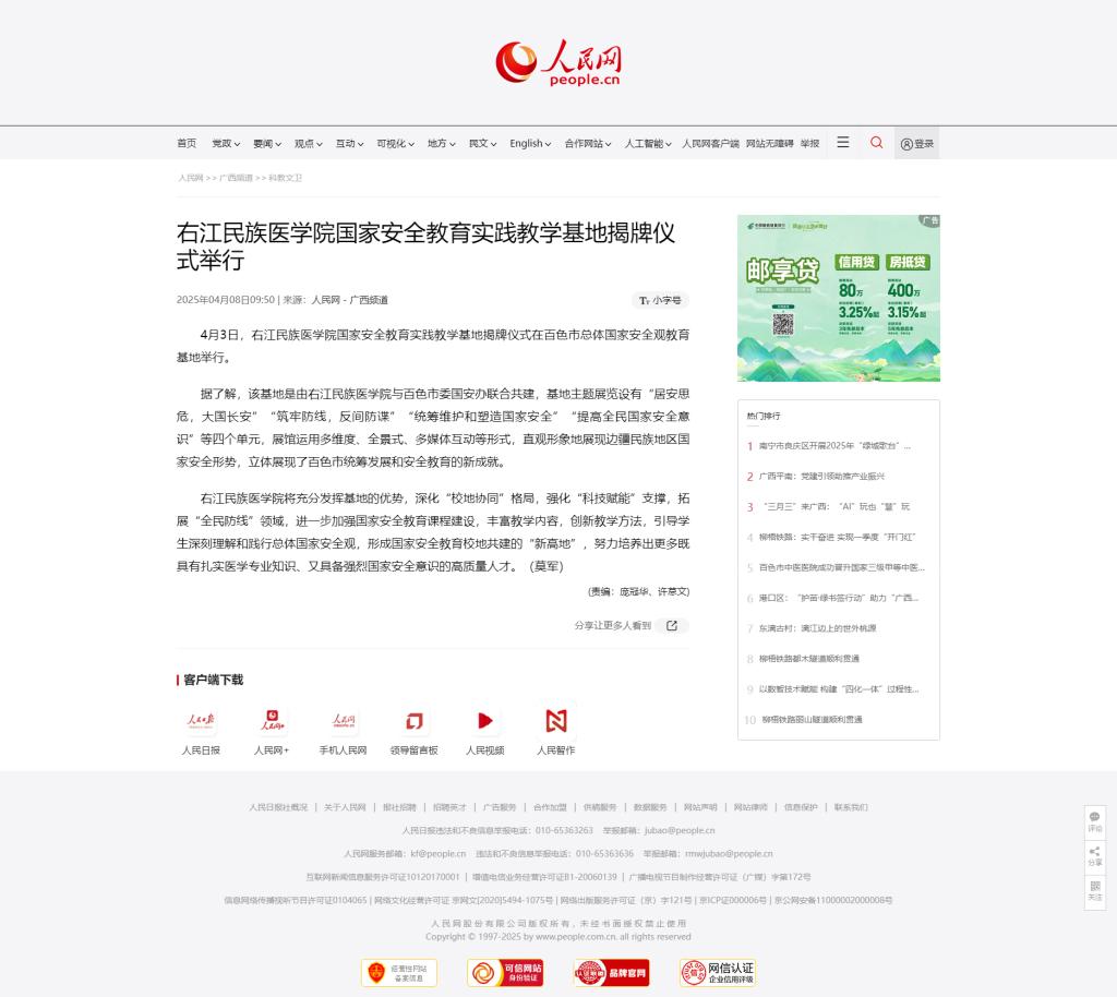 4月8日,人民网以《必赢242net官网国家安全教育实践教学基地揭牌仪式举行》为题,报道必赢官网与百色市委国安办联合共建的必赢242net官网国家安全教育实践教学基地揭牌并投入使用。
