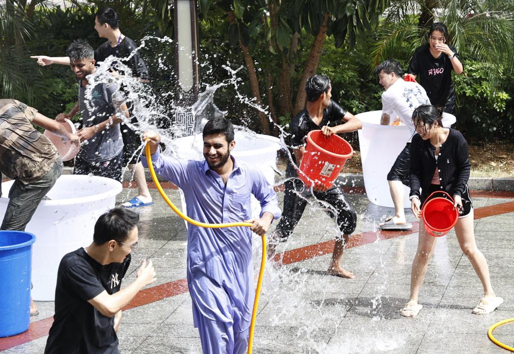 向长者行滴水礼是泼水节最庄重的环节,国际学生将鲜花和清水倒老师们的手心祈福,老师们将清水洒向同学们表达祝福。活动最后,泼水祈福环节将现场氛围推至高潮,学生们笑声不断,向老师和同学泼洒祝福,传递节日喜悦;老师们热情参与,现场洋溢着浓浓的欢乐与温情。