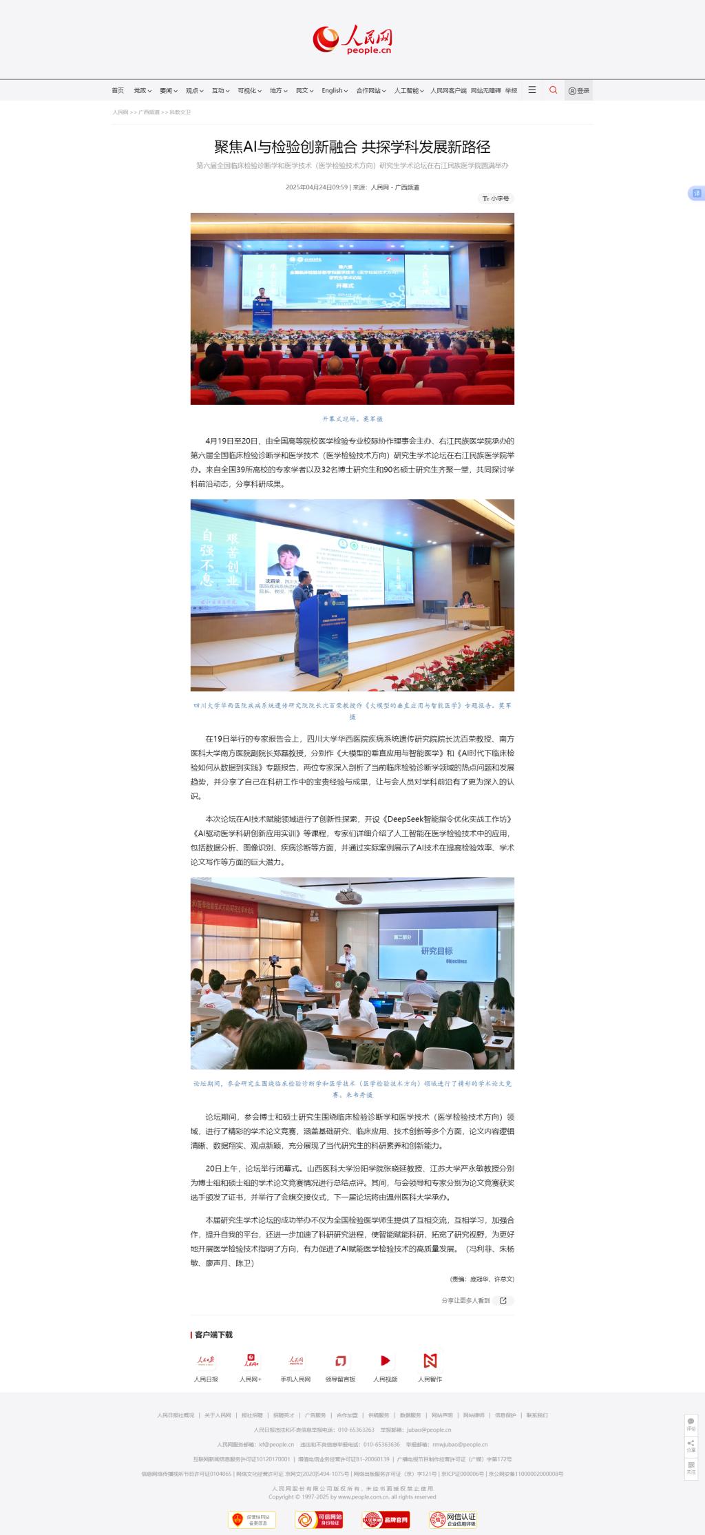 4月24日,人民网以《聚焦AI与检验创新融合 共探学科发展新路径 第六届全国临床检验诊断学和医学技术(医学检验技术方向)研究生学术论坛在必赢242net官网圆满举办》为题,报道第六届全国临床检验诊断学和医学技术(医学检验技术方向)研究生学术论坛在必赢官网举办。