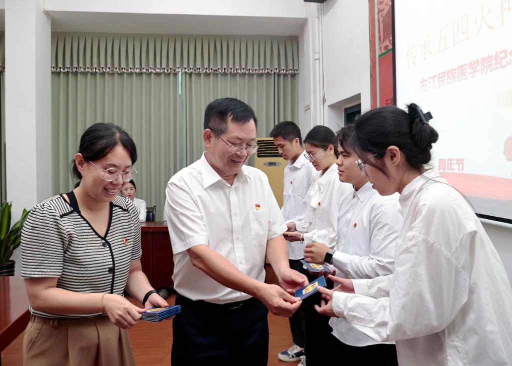李雪斌在会上希望全体右医团员青年要立大志,做心怀家国的追梦人,要以优秀青年为榜样,传承“大医精诚”校训,将个人理想与党和国家医疗卫生事业紧密相连,把个人的“小目标”融入健康中国的“大蓝图”之中,用青春的汗水书写属于自己的精彩篇章,让个人的梦想在祖国需要的天地中绽放光芒。要明大德,做崇德向善的践行者,要自觉践行社会主义核心价值观,牢固树立科学的世界观、积极的人生观和正确的价值观,做到明大德、守公德、严私德,努力成为一个有大爱、大德、大情怀的医者。要成大才,做本领过硬的奋斗者,要以理论为导航、以实践为羽翼,主动将人工智能等科技融入医学学习与实践,为医学成长赋能,以创新为笔、实践为墨,勇立时代潮头。要担大任,做勇毅前行的开拓者,要珍惜时代赋予的机遇,不负韶华,积极投身到祖国最需要的地方去,在实践中磨砺自己、增长才干,在实现中国梦、建设好家乡的生动实践中放飞青春梦想。