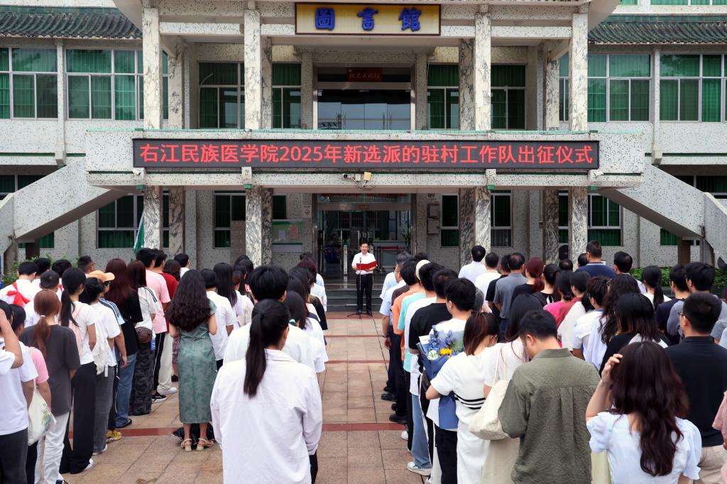 5月7日上午,必赢官网在百城校区大医广场举行2025年新一轮驻村工作队出征仪式,学校领导李雪斌、黄龙坚、赵丽娟、周艳娥、解继胜、王俊利、2025年新选派的驻村工作队队员、相关职能部门和二级学院负责人、师生代表参加,出征仪式由学校党委副书记赵丽娟主持。