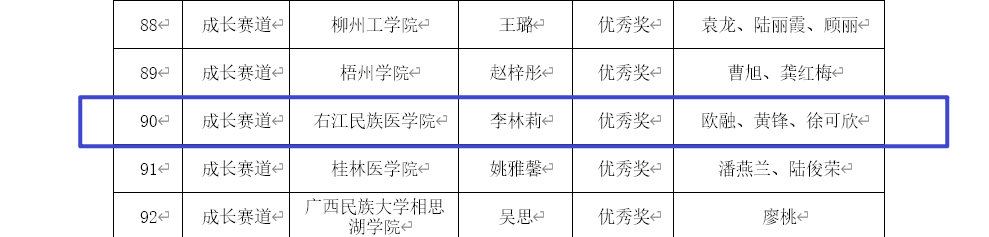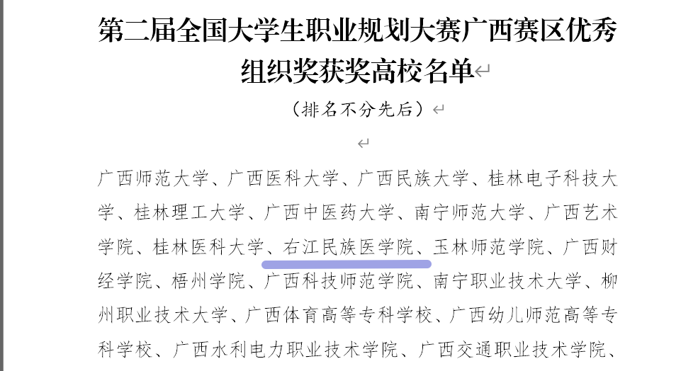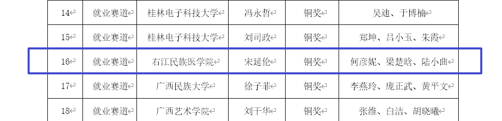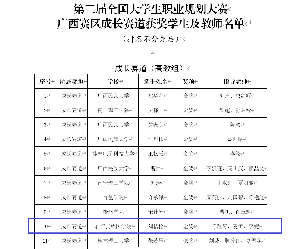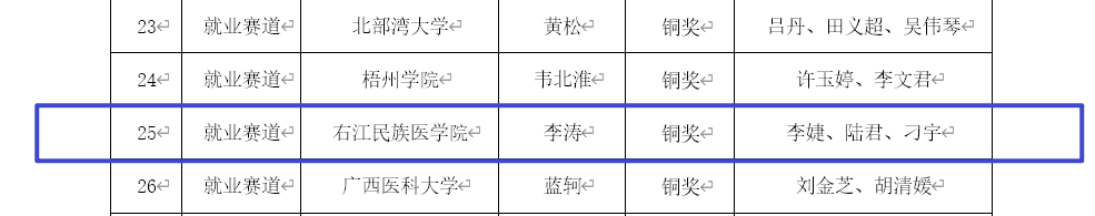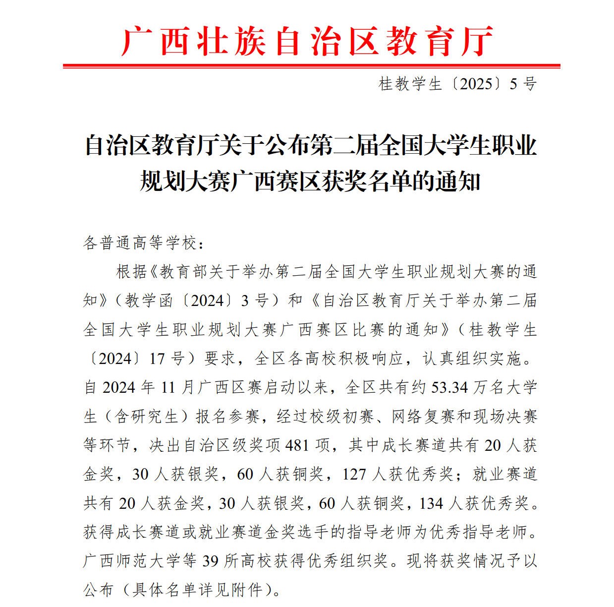 根据《自治区教育厅关于公布第二届全国大学生职业规划大赛广西赛区获奖名单的通知》(教学生〔2025〕5号),必赢官网在第二届全国大学生职业规划大赛广西赛区比赛中,学校荣获广西赛区“优秀组织奖”集体奖。其中,共计5名学生荣获奖项:2024级护理学本科班刘桔松同学荣获高教组成长赛道金奖;2021级临床医学本科10班李涛同学荣获高教组就业赛道铜奖;2023级医学技术硕士研究生班宋延伦同学荣获高教研究生组就业赛道铜奖;2022级口腔医学本科阮诗婷、2023级临床医学本科11班李林莉同学荣获高教组成长赛道优秀奖。陈璟涛、麦伊、李婕3位老师荣获广西区赛“优秀指导老师”称号。实现学校在此项赛事的突破!
