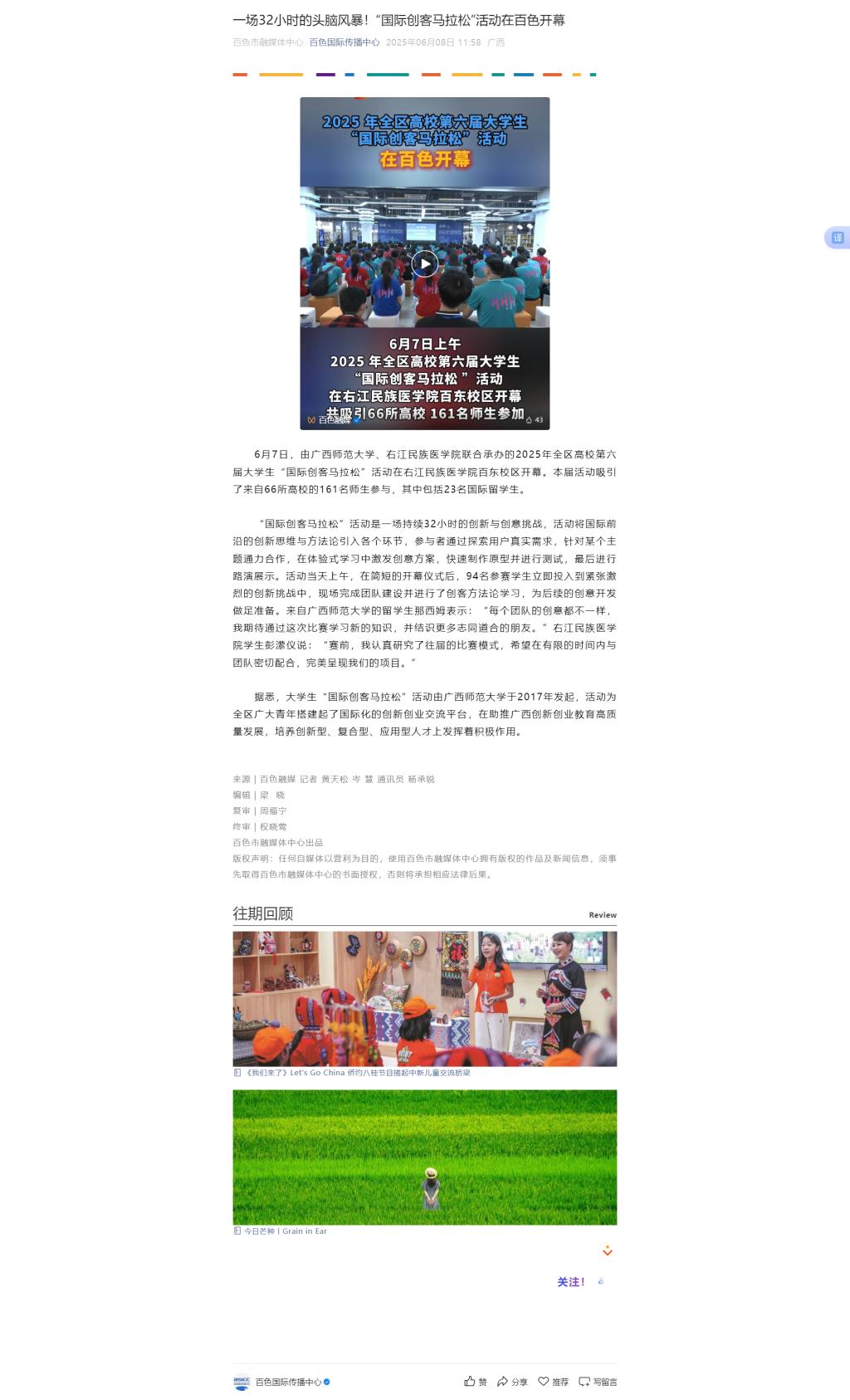 6月8日,百色国际传播中心以《一场32小时的头脑风暴!“国际创客马拉松”活动在百色开幕》为题,报道2025年全区高校第六届大学生“国际创客马拉松”活动在必赢242net官网百东校区开幕。