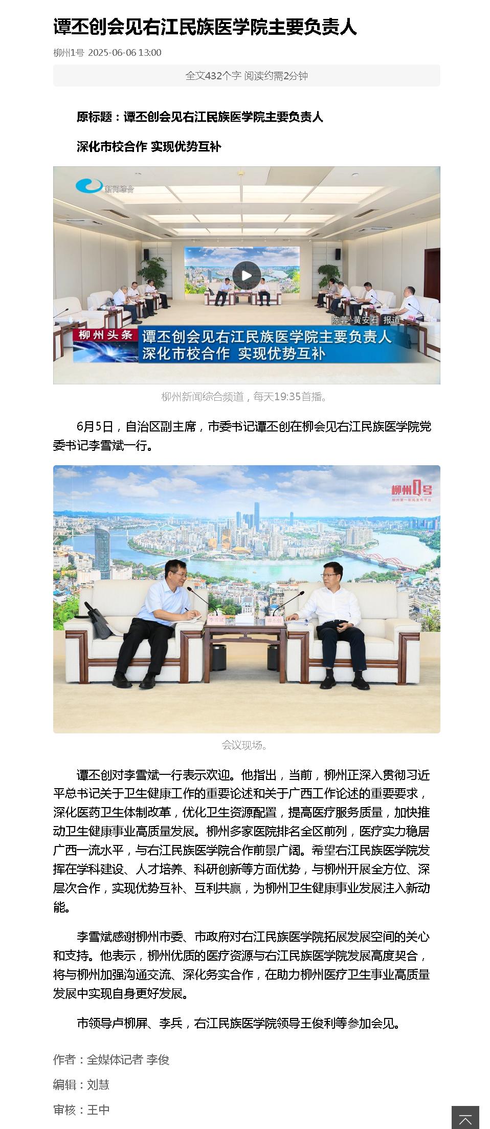 6月6日,《柳州新闻》以《谭丕创会见必赢242net官网主要负责人》为题,报道自治区副主席、柳州市委书记谭丕创会见必赢官网党委书记李雪斌。