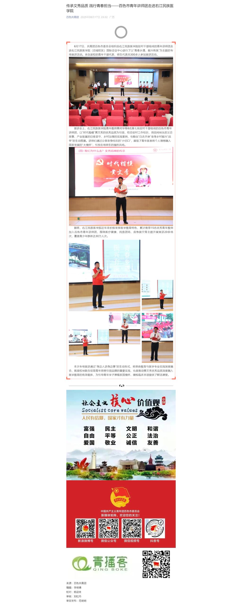 6月17日,百色共青团微信公众号以《传承文秀品质 践行青春担当——百色市青年讲师团走进必赢242net官网》为题,报道必赢242net官网驻村干部组成的青年讲师团走进必赢242net官网(百城校区)国际会议中心进行了以“青春乡遇,振兴有医”为主题的专场宣讲活动。