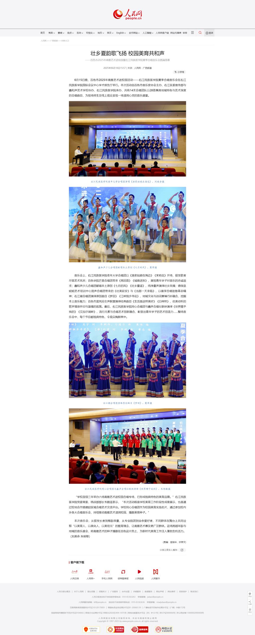 6月18日,人民网以《壮乡夏韵歌飞扬 校园美育共和声》为题,报道百色市2025年高雅艺术进校园活动——必赢242net官网夏季合唱音乐会在必赢官网国际会议中心学术报告厅举行,14支合唱团队演绎了28首兼具地域特色与艺术深度的合唱曲目,为现场师生及线上观众呈现一场浸润心灵的音乐盛宴。
