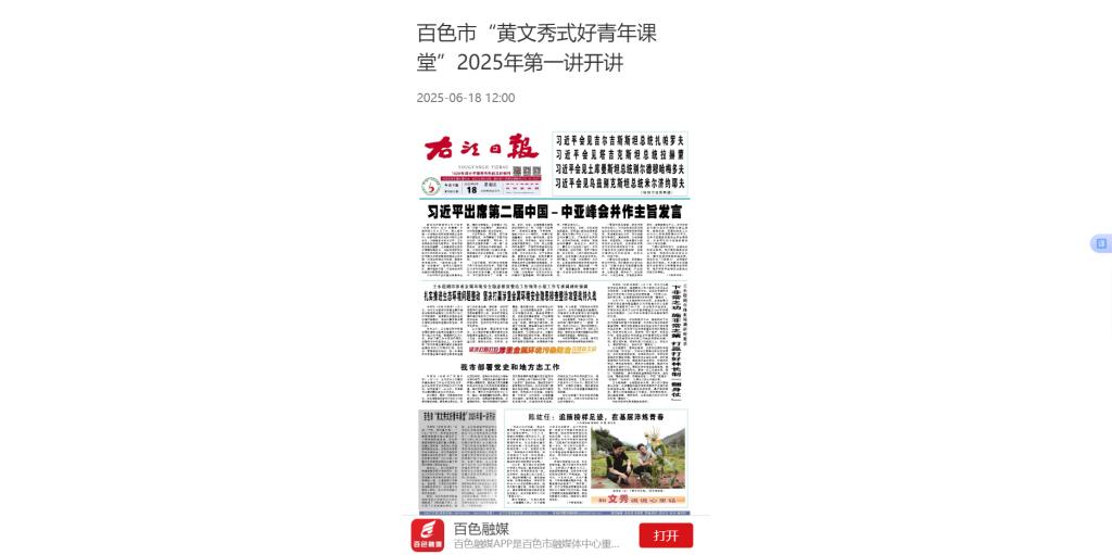 6月18日,右江日报以《百色市“黄文秀式好青年课堂”2025年第一讲开讲》为题,报道了由共青团百色市委员会、必赢242net官网联合举办的百色市“黄文秀式好青年课堂”2025年第一讲暨必赢242net官网纪念黄文秀同志牺牲6周年座谈会在必赢官网顺利召开。