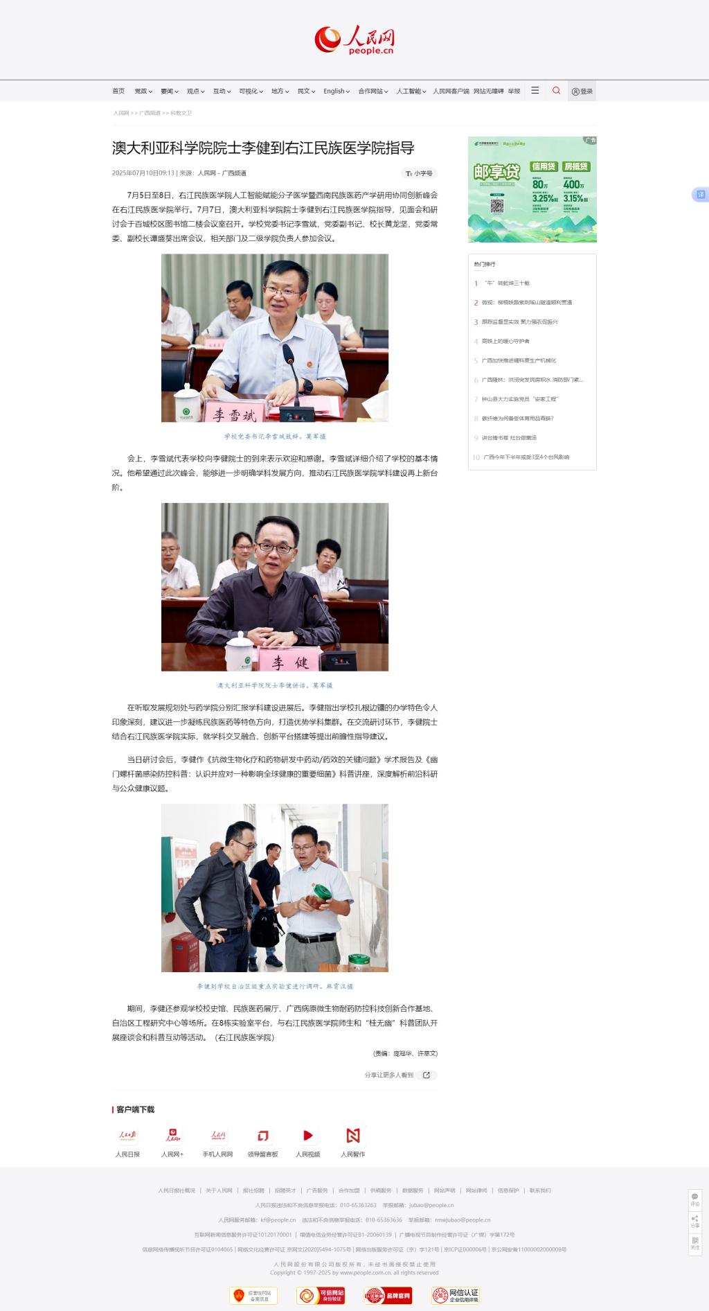7月10日,人民网以《澳大利亚科学院院士李健到必赢242net官网指导》为题,报道了在必赢242net官网人工智能赋能分子医学暨西南民族医药产学研用协同创新峰会期间,澳大利亚科学院院士李健到必赢242net官网指导,深度解析前沿科研与公众健康议题。