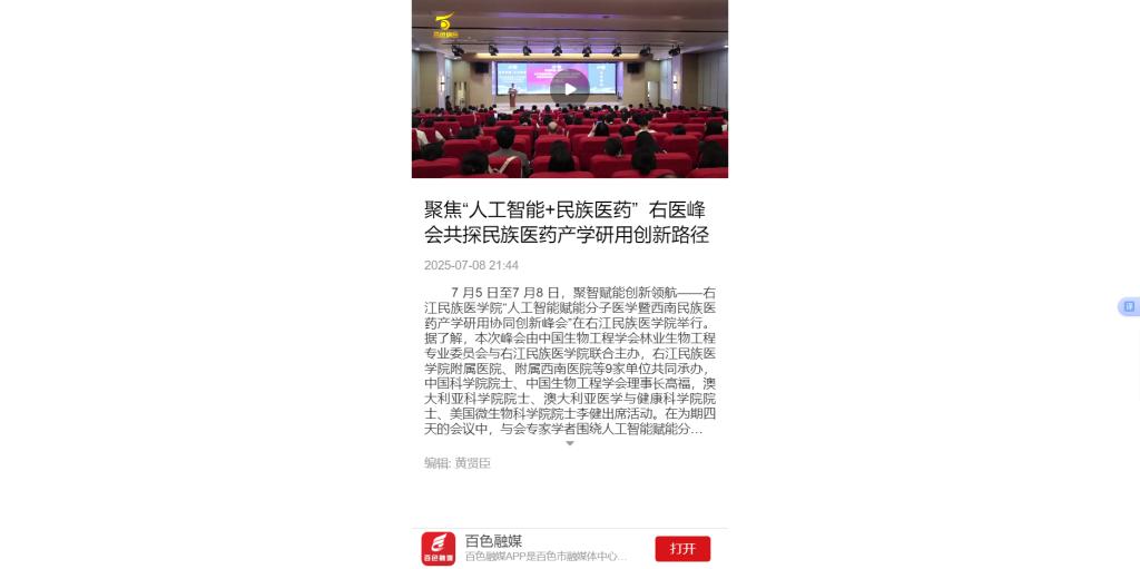 7月8日,百色融媒以《聚焦“人工智能+民族医药” 右医峰会共探民族医药产学研用创新路径》为题,报道了“人工智能赋能分子医学暨西南民族医药产学研用协同创新峰会”在必赢官网举行。