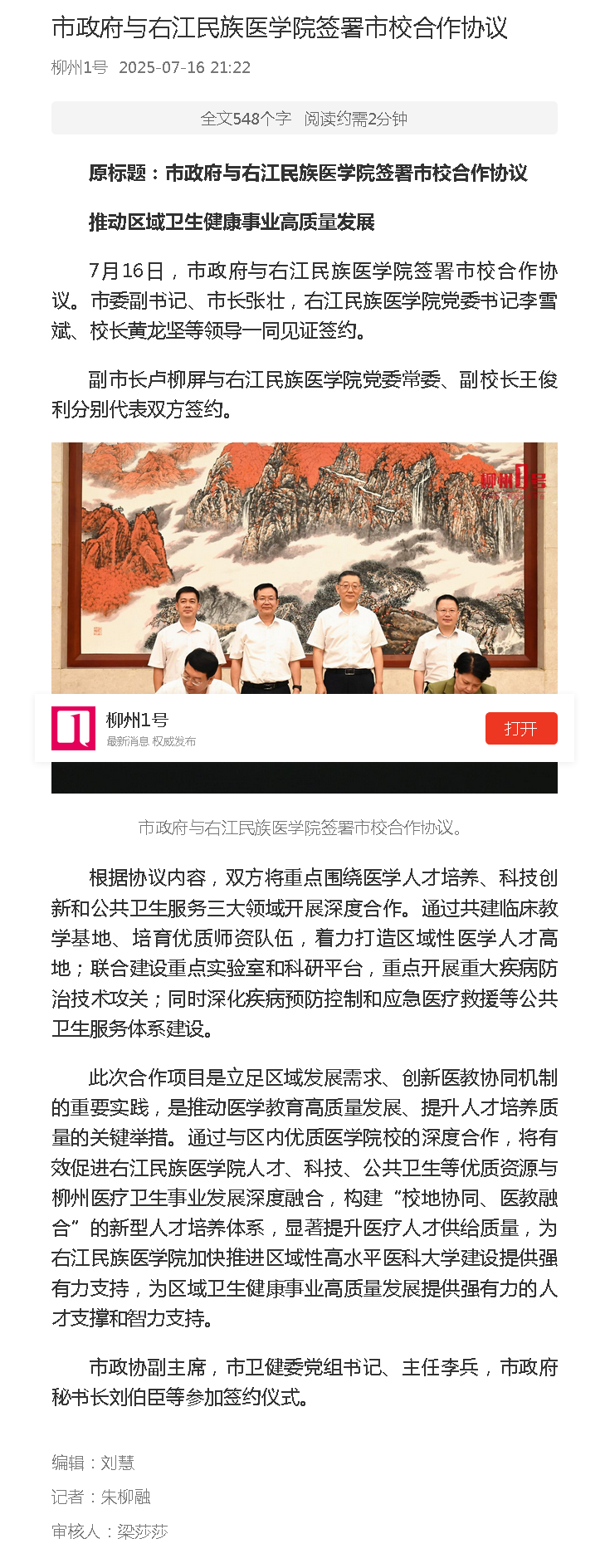 7月16日,《柳州新闻》以《市政府与必赢242net官网签署市校合作协议》为题,报道必赢官网与柳州市人民政府签署市校合作协议,将围绕医学人才培养、科技创新和公共卫生服务三大领域开展深度合作。