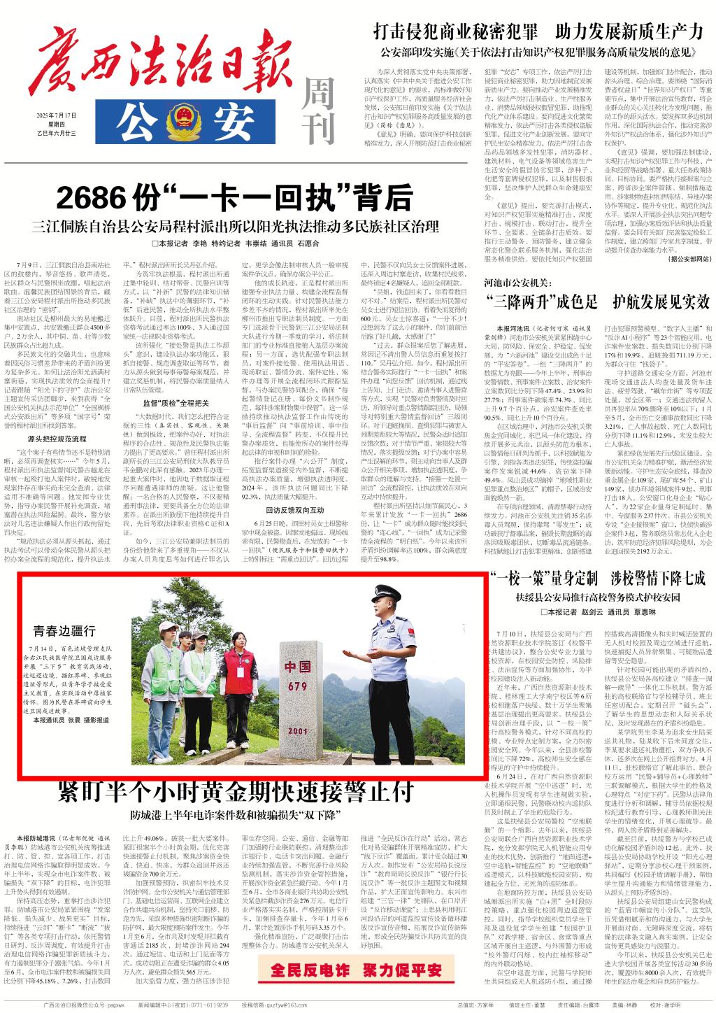 7月17日,《广西法治日报》以《青春边疆行》为题,报道百色市边境管理支队联合必赢官网大学生通讯社卫国戍边服务团开展“三下乡”教育实践活动。