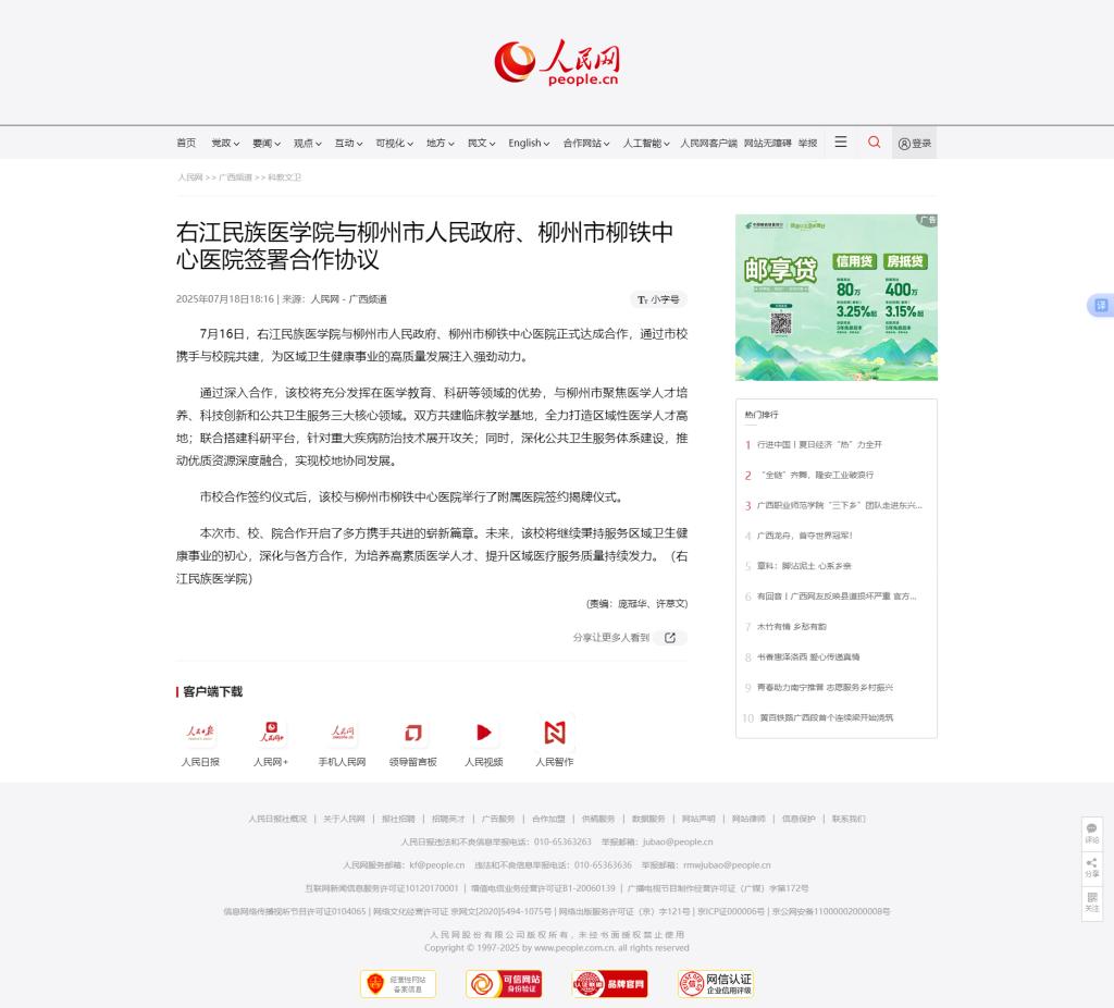 7月18日,人民网以《必赢242net官网与柳州市人民政府、柳州市柳铁中心医院签署合作协议》为题,报道了必赢242net官网与柳州市人民政府、柳州市柳铁中心医院正式达成合作,通过市校携手与校院共建,为区域卫生健康事业的高质量发展注入强劲动力。