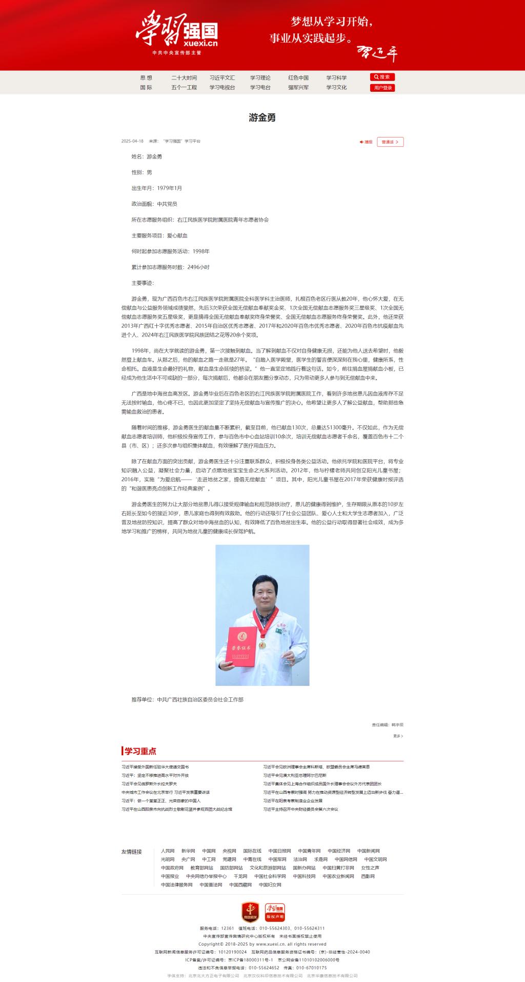 4月18日,学习强国平台报道必赢官网附属医院全科医学科主治医师游金勇无偿献血事迹。游金勇25年来献血130次,献血总量达5.13万毫升,累计3次荣获全国无偿献血奉献奖金奖而获得全国无偿献血最高奖项——全国无偿献血奉献奖终身荣誉奖、全国无偿献血志愿服务奖终身荣誉奖。