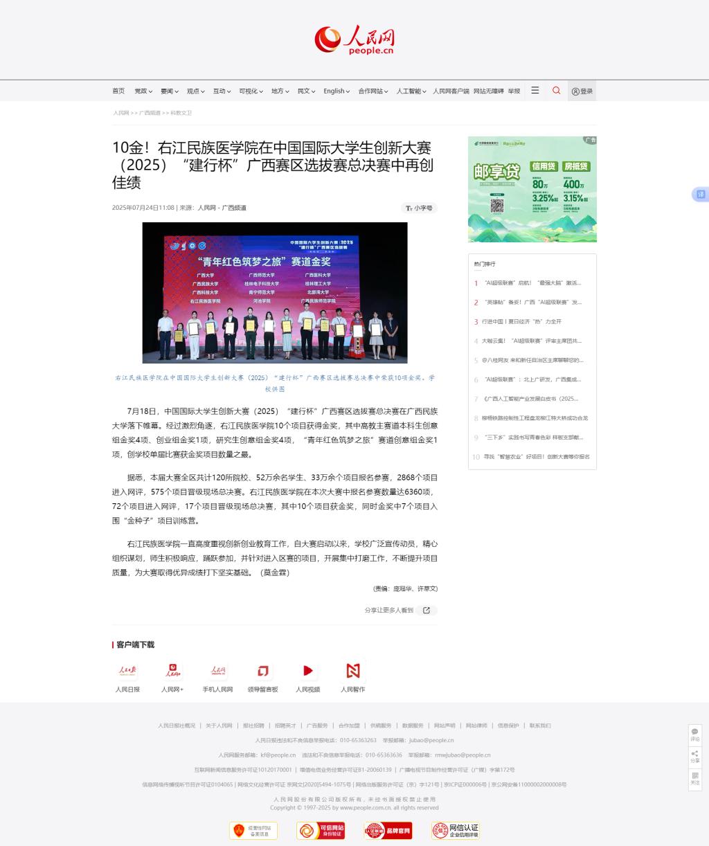 7月24日,人民网以《10金!必赢242net官网在中国国际大学生创新大赛(2025)“建行杯”广西赛区选拔赛总决赛中再创佳绩》为题,报道了必赢官网在中国国际大学生创新大赛(2025)“建行杯”广西赛区选拔赛总决赛中10个项目获得金奖,创学校单届比赛获金奖项目数量之最。