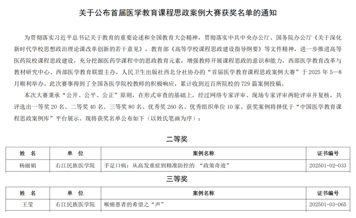 近日,由西部医学教育改革与教材研究中心、西部医学教育联盟主办,人民卫生出版社西北分社协办的“首届医学教育课程思政案例大赛”圆满落幕并公布获奖结果。本次大赛旨在深入贯彻落实习近平总书记关于教育的重要论述和全国教育大会精神,推进高等医药院校课程思政建设,挖掘医药学课程中的思政教育元素,提升教师开展课程思政的意识和能力。