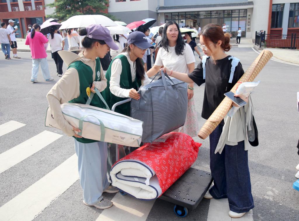 由高年级学生组成的志愿者队伍穿梭于人群之中,帮提行李、指引路线、协助办理手续;在汽车站和动车站,学校还设立迎新点,安排校车“点对点”接送新生与家长。