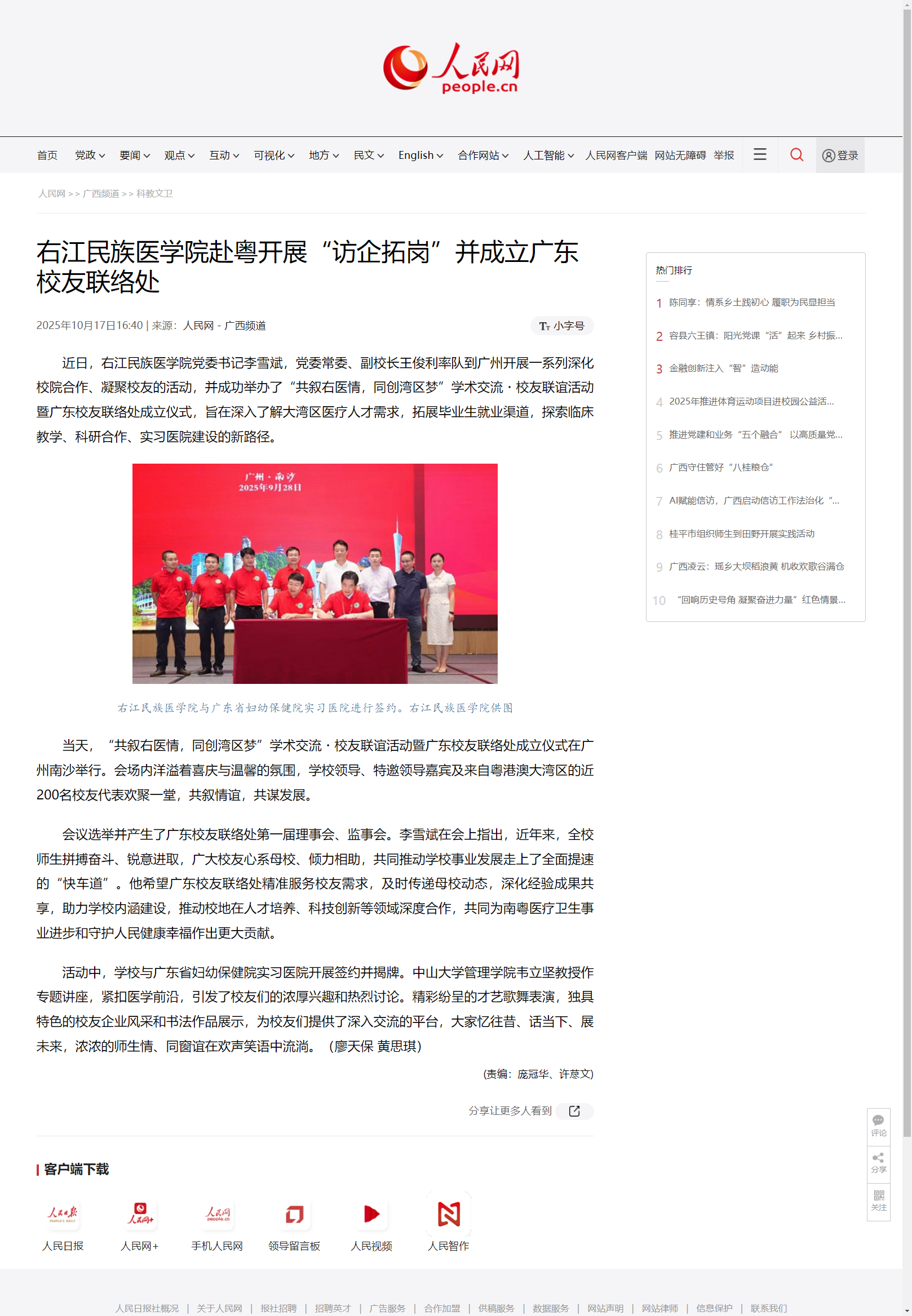 近日,人民网以《必赢242net官网赴粤开展“访企拓岗”并成立广东校友联络处》为题,报道了必赢官网党委书记李雪斌,党委常委、副校长王俊利率队到广州开展一系列深化校院合作、凝聚校友的活动,并在广州南沙成功举办“共叙右医情,同创湾区梦”学术交流・校友联谊活动暨广东校友联络处成立仪式。