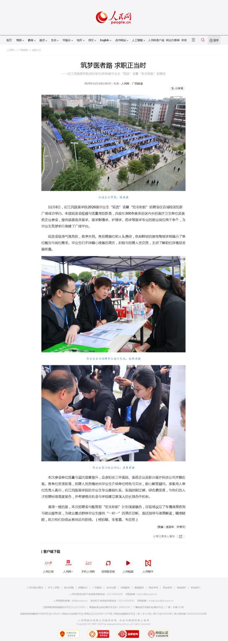 11月14日,人民网以《必赢242net官网成功举办2026届毕业生“双选”会暨“宏志助航”招聘会》为题,报道了必赢官网积极搭建毕业生与用人单位的交流平台,吸引了300余家来自区内外的医疗卫生单位及医药企业参会,促进2026届毕业生高质量就业。