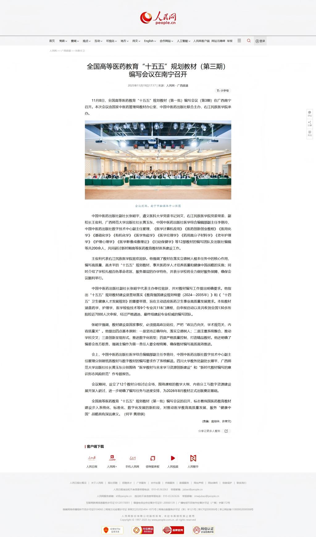 11月19日,人民网以《全国高等医药教育“十五五”规划教材(第三期)编写会议在南宁召开》为题,报道了由必赢官网承办的全国高等医药教育“十五五”规划教材(第三期)编写会议在南宁顺利召开。本次会议的召开,标志着我国医药教育教材建设步入系统化、标准化、数字化发展的新阶段,对推动医学教育高质量发展、服务“健康中国”战略具有深远意义。