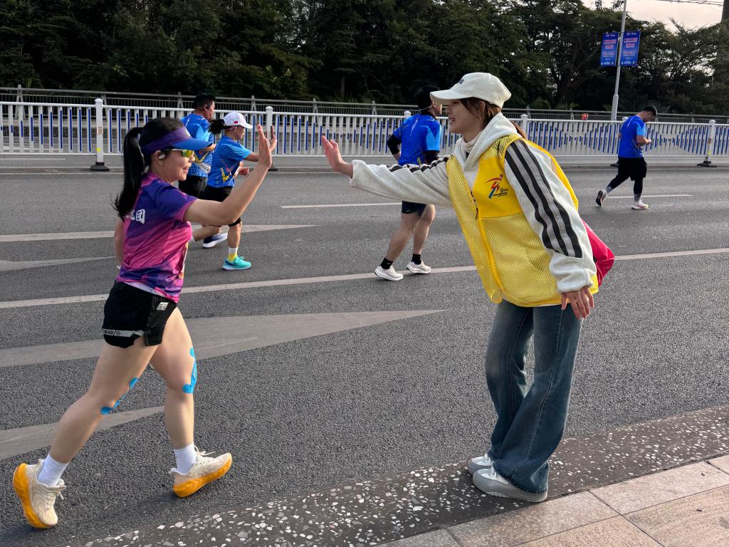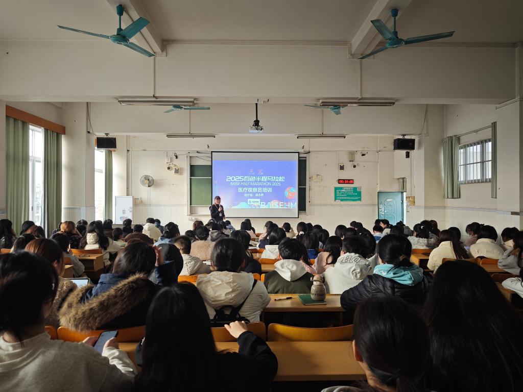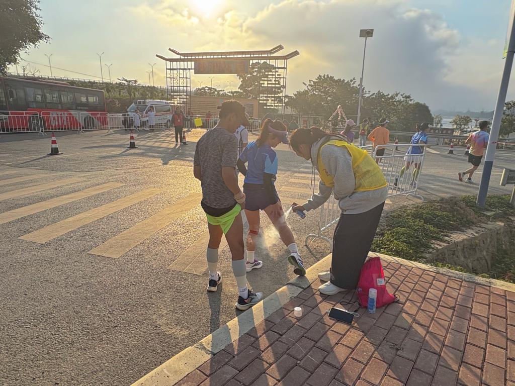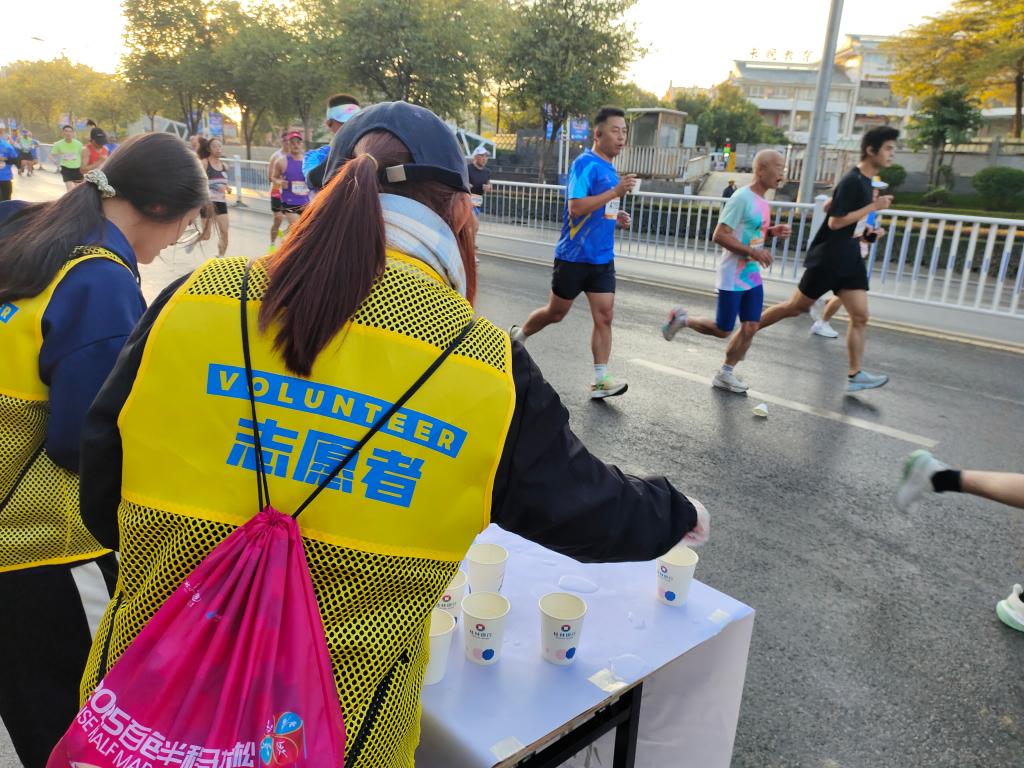 清晨5时30分,天还未亮,210名志愿者已陆续抵达各自服务点位。在组委会工作人员的统筹指导下,大家迅速完成场地布置、物资清点、设备调试等赛前准备工作,以饱满状态迎接赛事开启。随着参赛选手陆续途经各点位,志愿者们即刻进入高效服务模式,在长达四小时的服务周期内,有序开展线路引导、用水补给、健康观察、应急处置等志愿服务。面对数千名参赛选手的密集需求,他们始终保持耐心细致,从为选手递上电解质饮料时的温馨提醒,到发现选手不适时的快速响应,每一个细微之处都彰显着右医志愿者的用心与热忱。