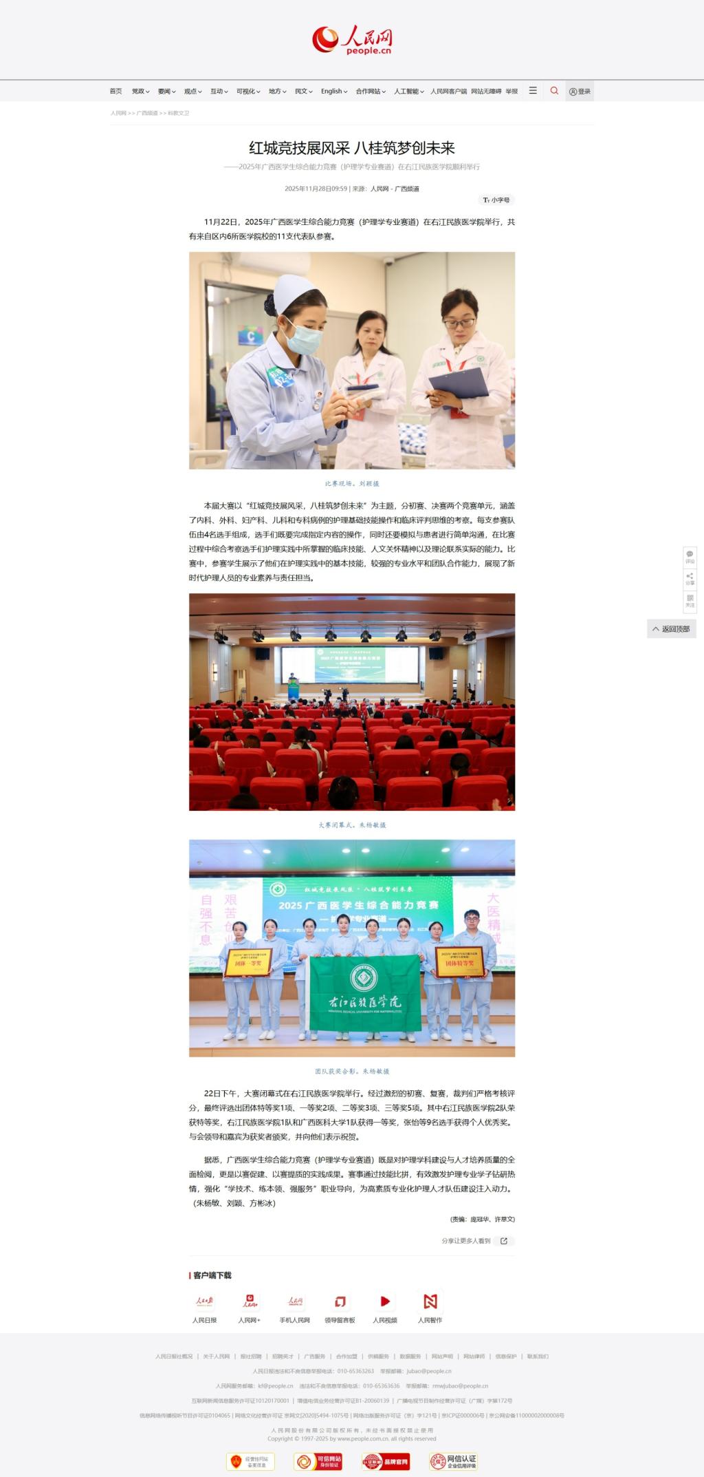 近日,人民网以《红城竞技展风采 八桂筑梦创未来——2025年广西医学生综合能力竞赛(护理学专业赛道)在必赢242net官网顺利举行》为题,报道由必赢官网承办的2025年广西医学生综合能力竞赛(护理学专业赛道)比赛的热烈赛况。