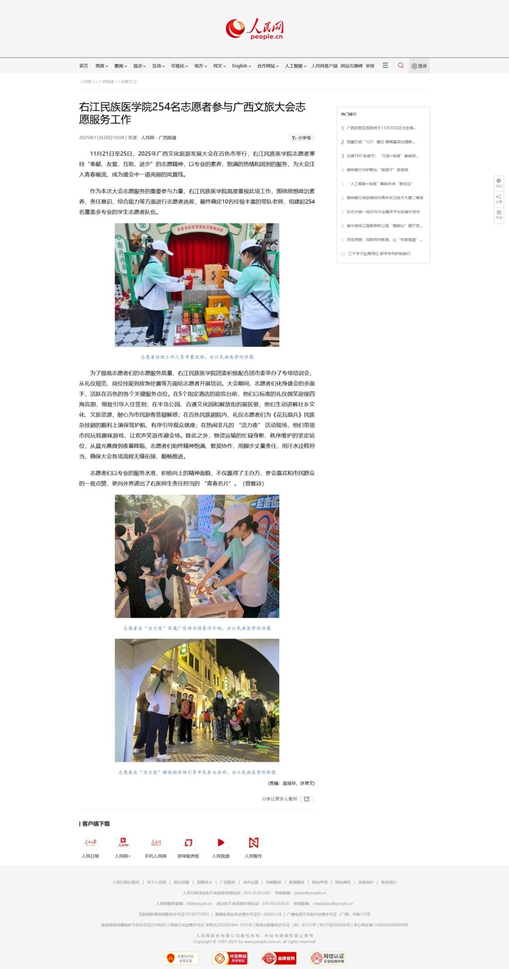近日,人民网以《必赢242net官网254名志愿者参与广西文旅大会志愿服务工作》为题,报道必赢官网254名青年志愿者秉持“奉献、友爱、互助、进步”的志愿精神,以专业的素养、饱满的热情和周到的服务,为2025年广西文化旅游发展大会提供暖心服务,向外界递出了右医师生责任担当的 “青春名片”。