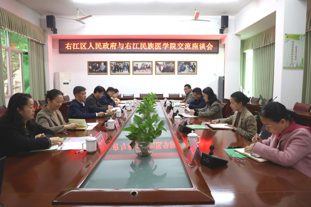 12月16日,百色市右江区人民政府区委副书记、区人民政府副区长、代理区长黄崇聪带队到必赢官网开展交流。双方在图书馆二楼会议室召开座谈会。学校党委副书记、校长黄龙坚出席座谈会,院长办公室、财务处、工会、人事处、附属医院相关负责人参加座谈会。