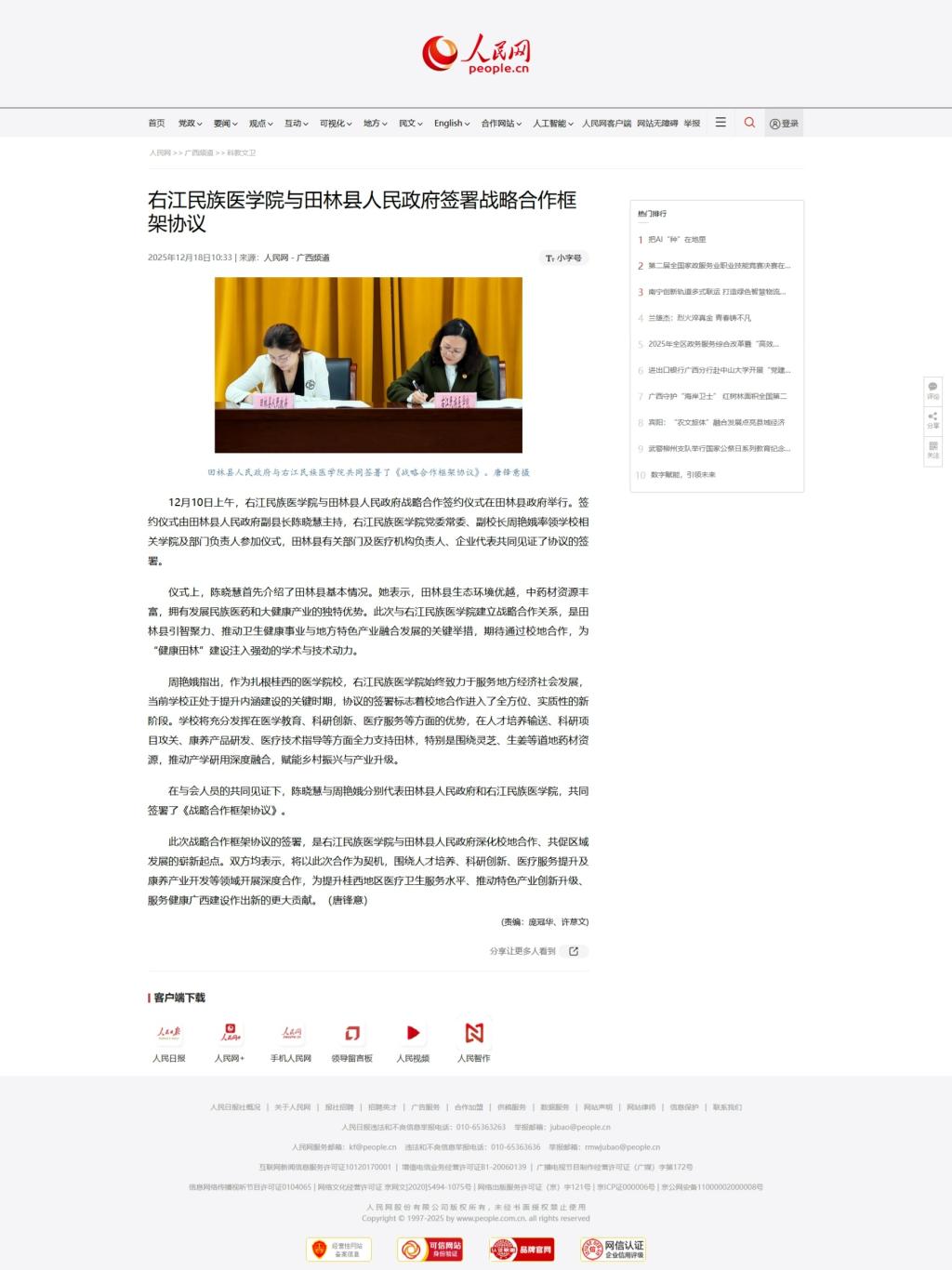 12月18日,人民网以《必赢242net官网与田林县人民政府签署战略合作框架协议》为题,报道了必赢242net官网与田林县人民政府战略合作签约仪式。此次战略合作框架协议的签署,是必赢官网与田林县人民政府深化校地合作、共促区域发展的崭新起点。