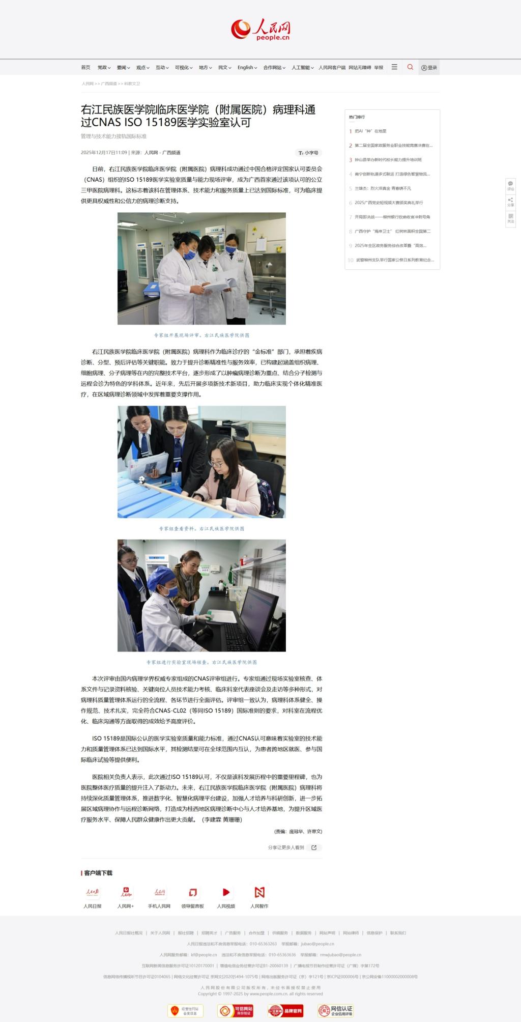 12月17日,人民网以《必赢242net官网临床医学院(附属医院)病理科通过CNAS ISO 15189医学实验室认可》为题,报道必赢官网临床医学院(附属医院)病理科成功通过中国合格评定国家认可委员会(CNAS)组织的ISO 15189医学实验室质量与能力现场评审,成为广西首家通过该项认可的公立三甲医院病理科。