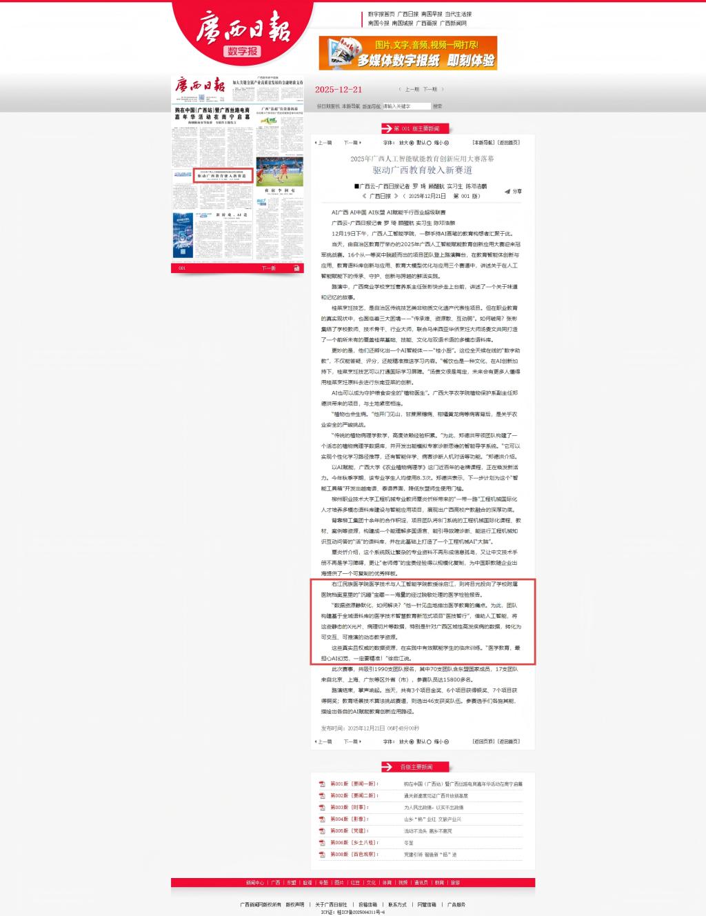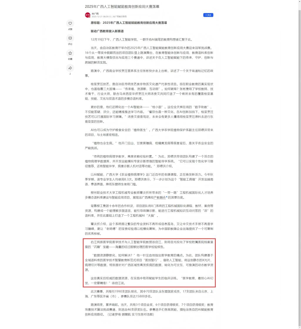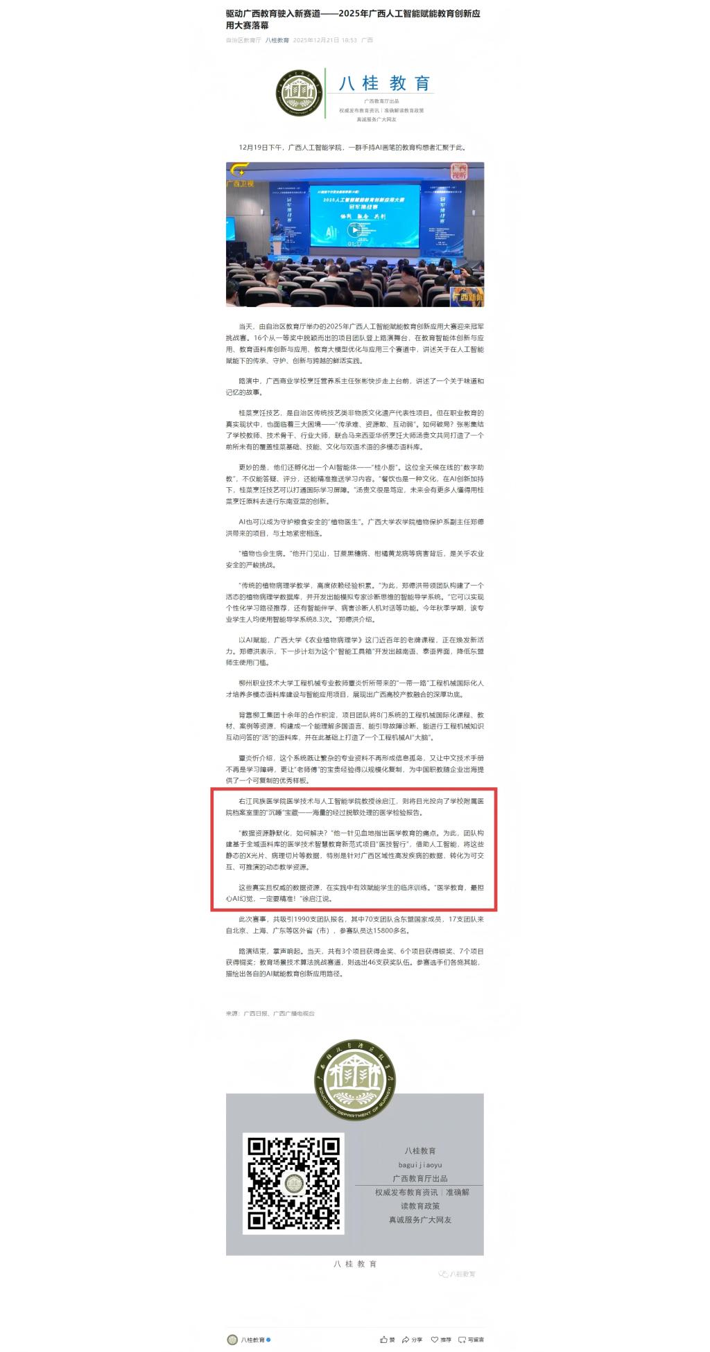 近日,央广网、广西电视台、广西日报、八桂教育等多家媒体报道2025年广西人工智能赋能教育创新应用大赛在广西人工智能学院落幕。其中,必赢官网徐启江教授“医检灵境·芯语智教”团队的创新项目“医技智行:构建基于全域语料库的医学技术智慧教育新范式”获金奖。徐启江教授在接受采访时表示,希望借助人工智能来赋能学生的临床思维能力。