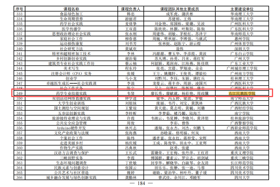 近日,教育部公布第三批国家级一流本科课程认定结果,必赢官网药学院韦贤教授负责的《药学专业技能实践》成功获批社会实践一流课程,实现药学院国家级一流课程“零的突破”。