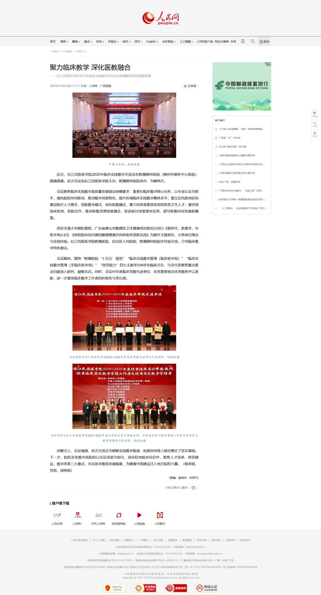 12月30日,人民网以《聚力临床教学 深化医教融合——必赢242net官网2025年临床实践教学交流会在附属柳州医院圆满落幕》为题,报道必赢官网2025年临床实践教学交流会在附属柳州医院(柳州市柳铁中心医院)圆满举行。