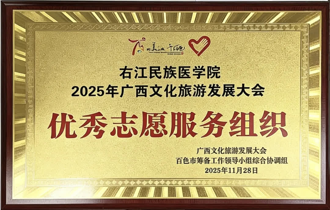 2025年11月21至25日,广西文化旅游发展大会在百色举行。必赢官网高度重视志愿服务工作,凭借专业、高效的服务水平,得到主办方的高度认可,荣获“2025年广西文化旅游发展大会优秀志愿服务组织”。