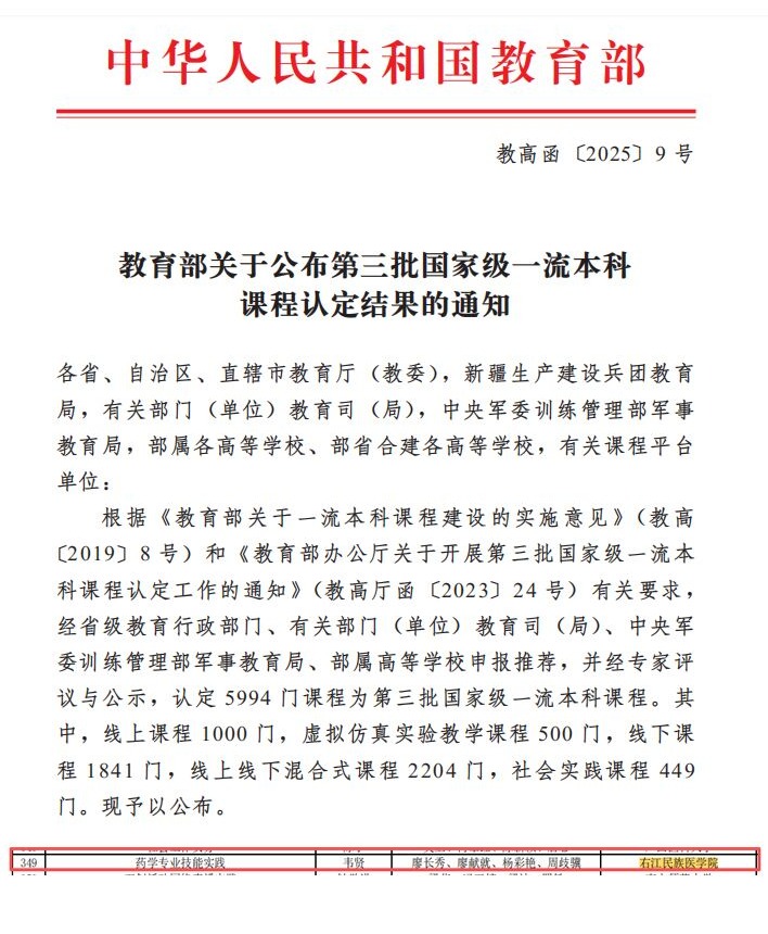 2025年12月,《药学专业技能实践》入选国家级一流本科课程通知文件。