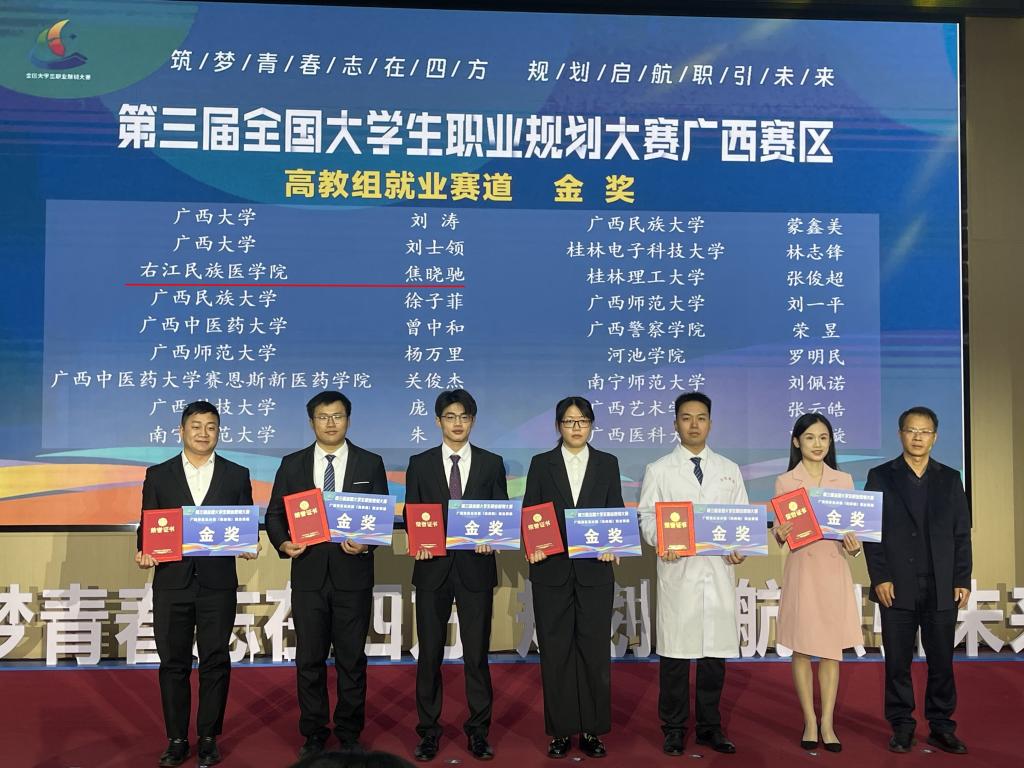 冬日邕城,赛场竞逐展风采;规划启航,青春逐梦启新程。日前,第三届全国大学生职业规划大赛广西赛区总决赛在南宁圆满落幕。本届大赛以“筑梦青春志在四方,规划启航职引未来”为主题,共吸引全区86所高校近69万名学生和约1600名教师参赛。必赢官网学子凭借扎实的职业素养与卓越的综合能力脱颖而出,神经外科专硕焦晓驰同学勇夺就业赛道高教研究生组金奖,护理学专硕刘奕慷同学斩获银奖。