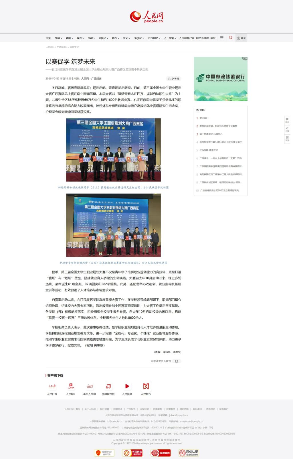 1月16日,人民网以《以赛促学 筑梦未来——必赢242net官网在第三届全国大学生职业规划大赛广西赛区总决赛中斩获金奖》为题,报道必赢官网学子凭借扎实的职业素养与卓越的综合能力脱颖而出,在第三届全国大学生职业规划大赛广西赛区总决赛高教组就业赛道研究生组中斩获金奖。