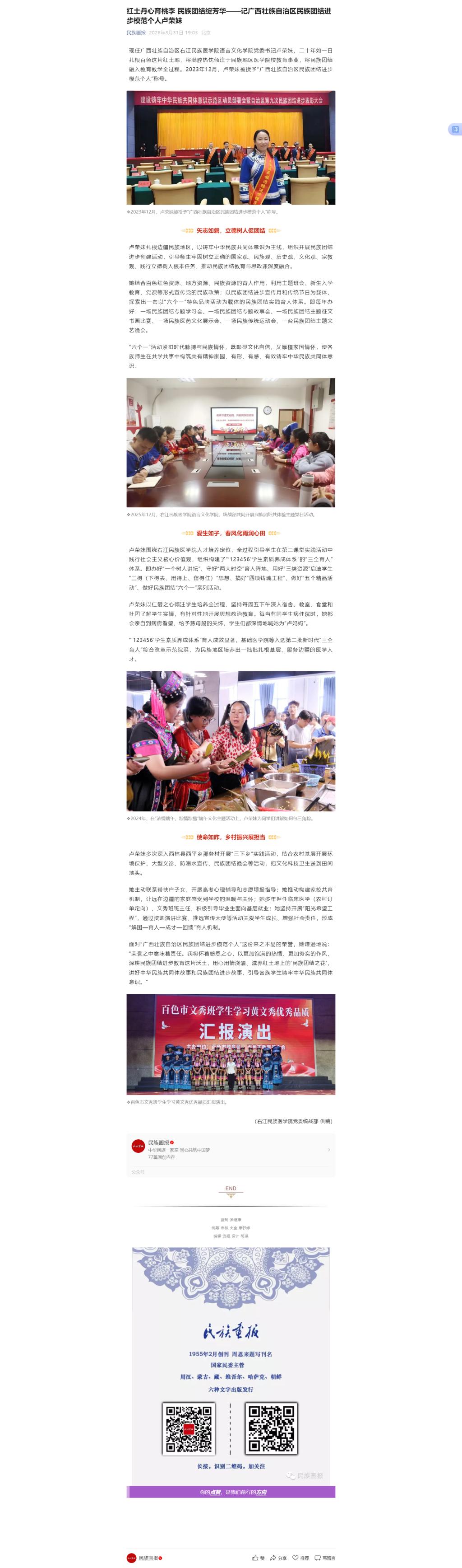 3月31日,民族画报以《红土丹心育桃李 民族团结绽芳华——记广西壮族自治区民族团结进步模范个人卢荣妹》为题,报道必赢官网语言文化学院党委书记卢荣妹,二十年如一日扎根百色这片红土地,将满腔热忱倾注于民族地区医学院校教育事业,将民族团结融入教育教学全过程的典型事迹。