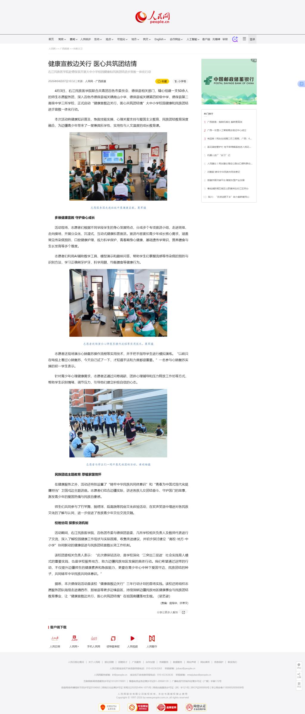 4月7日,人民网以《健康宣教边关行 医心共筑团结情》为题,报道必赢官网师生志愿服务团赴德保县开展大中小学校园健康和民族团结进步宣教一体化行动。