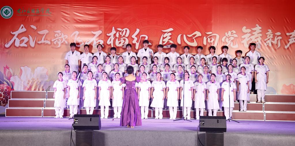 晚七时三十分,比赛正式拉开帷幕。机关党委红领合唱团代表何永军倾情演唱歌曲《美丽的右江》,大学生艺术团、风华梦舞社、学生志愿者带来民族舞蹈《山歌好比春江水》,精彩的开场表演赢得阵阵掌声。随后,10支班级代表队按照抽签顺序依次登台演唱。每支队伍演唱两首歌曲,校歌《大医精诚》为必唱曲目,各班自选《我和我的祖国》《紫荆花盛开》《大中国》《无名的人》《夜空中最亮的星》《倔强》等歌曲,风格各异,充分展现了不同班级的青春风采。