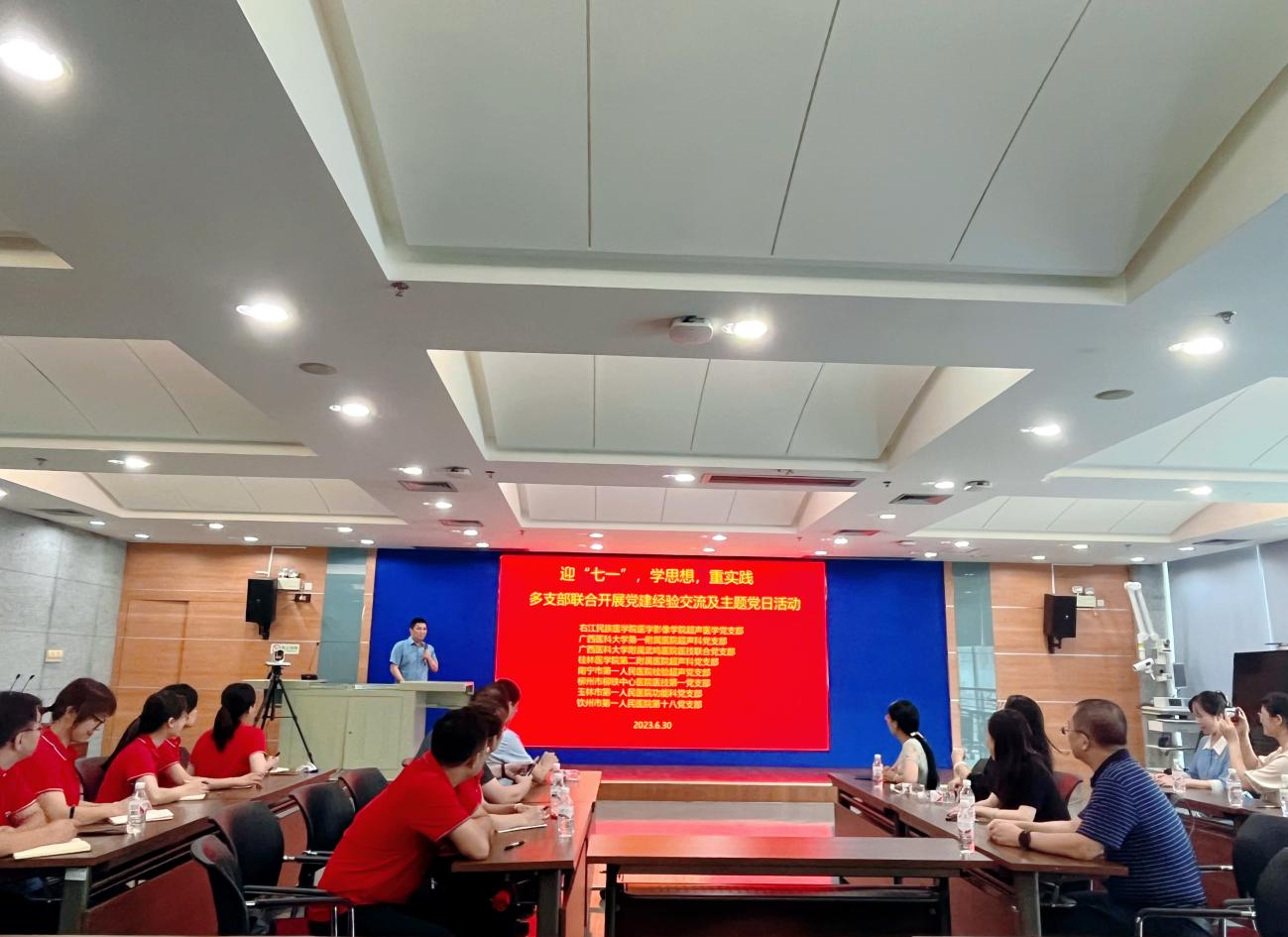 为深入学习贯彻习近平新时代中国特色社会主义思想,赓续红色血脉、砥砺初心使命,进一步强化党建引领,更好发挥党组织的战斗堡垒作用和党员的先锋模范作用。6月30日下午,医学影像学院超声医学党支部与校外党支部联合开展党建工作经验交流会及迎“七一”主题党日活动。本次活动有必赢242net官网医学影像学院超声医学党支部、广西医科大学第一附属医院超声科党支部、广西医科大学附属武鸣医院医技联合党支部、桂林医学院第二附属医院超声科党支部、南宁市第一人民医院检验超声党支部、柳州市柳铁中心医院医技第一党支部、玉林市第一人民医院功能科党支部及钦州市第一人民医院第十八党支部等8个党支部党员参加,活动由医学影像学院超声医学党支部书记陈成彩同志主持。