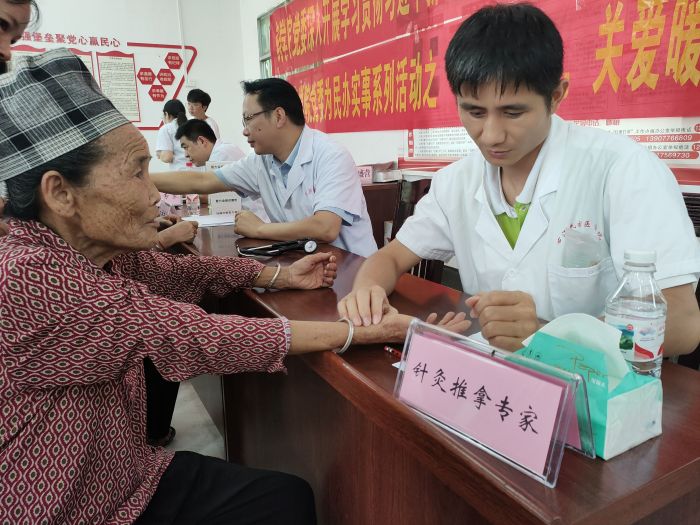 7月25日上午,药学院教师、附院专家在者么村开展义诊活动,送医上门,送药上门,为群众免费提供所需药品,并悉心指导群众进行有效保健。在义诊期间,“三下乡”志愿者团队向群众赠送复方金银花颗粒、罗汉果、龟苓膏等物品的同时让群众在排队义诊之余体验专业的按摩手法,舒筋活络。义诊当天,共发放医学科普宣传资料300多份,接受义诊群众200多人。