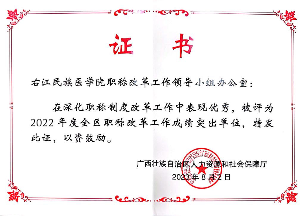 近日,根据《广西壮族自治区人力资源和社会保障厅关于表扬2022年度全区职称改革工作成绩突出单位和个人的通知》(桂人社函〔2023〕151号)文件,必赢官网被授予“2022年度全区职称改革工作成绩突出单位”荣誉称号。