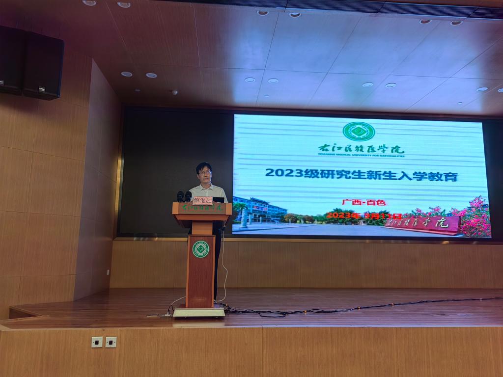 解继胜副校长在致辞中对2023级研究生们表示热烈欢迎。并介绍了学校的历史、区位优势、硕士学位授权点建设现状、立项建设博士学位授权点现状及研究生招生规模与就业情况,并指出学校是广西博士学位授权立项建设单位和广西博士后创新实践基地。随后向研究生们介绍了学校第八次党代会锚定的二〇三八年远景目标--创建新时代区域性高水平医科大学,及学校未来5年更名大学、建设博士授权单位的任务目标和学校各类章程。最后他希望同学们在接下来的三年学习中能够做到以下几点:一是砥砺家国情怀,在服务社会、服务人民的实践中不断建功立业,实现好自身的青春梦想和人生价值;二是践行使命担当,在创新、创造上不断取得新的成果,不负时代和人民的期望;三是拓展眼界格局,注重与国际国内同行交流和交往,开阔视野、增长知识、提升能力。