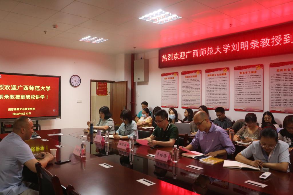 为提升必赢官网教师科研水平,提高教师科研项目申报成功率,增进与高水平院校的交流与合作,9月13日,国际语言文化教育学院邀请广西师范大学刘明录教授到我院作题为《国家社科基金项目申报选题与申报书撰写漫谈》专题讲座。学院领导、全体教师参加本次讲座。讲座由学院副院长李培隆教授主持。