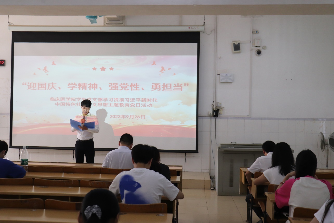 为庆祝中华人民共和国成立74周年,深入学习和理解党的思想理论,弘扬爱国主义精神和革命传统,营造热爱祖国的集体气氛,丰富同学们的校园生活,培养学生党员的实践能力,促进学生党员之间的学习交流,2023年9月26日,临床医学院学生党支部在5栋401开展以“迎国庆、学精神、强党性、勇担当”为主题的读书分享会活动。来自9个学生党支部的9名选手,分别围绕对所选图书的阅读心得体会,开展了精彩的PPT展示分享,临床医学院学生科科长肖刚老师、临床医学院团委书记覃富老师及各党支部党员、入党积极分子代表到场观摩比赛。