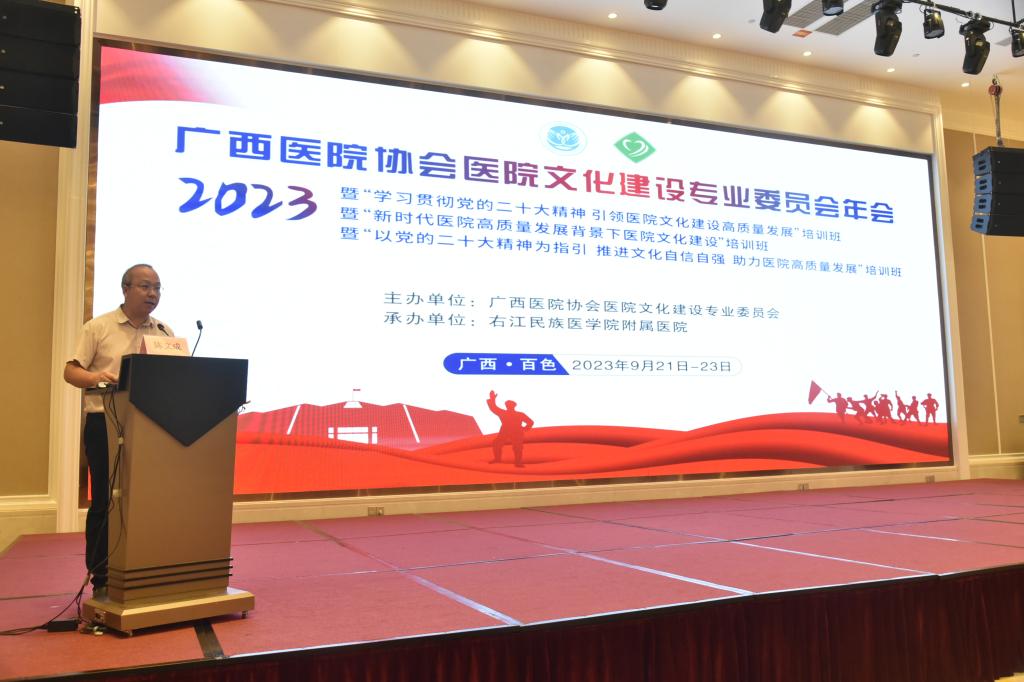 为深入学习贯彻习近平新时代中国特色社会主义思想和党的二十大精神,积极探索医院高质量发展背景下的医院文化建设新途径和新方法,2023年9月21-23日,必赢242net官网附属医院作为广西医院协会医院文化建设专业委员会主委单位,在百色市组织召开广西医院协会医院文化建设专业委员会2023年年会暨国家级医学继续教育项目“学习贯彻党的二十大精神 引领医院文化高质量发展培训班“、国家级医学继续教育项目”新时代医院高质量发展背景下医院文化建设培训班“、自治区级医学继续教育项目”以党的二十大精神为指引 推进文化自信自强 助力医院高质量发展培训班“。